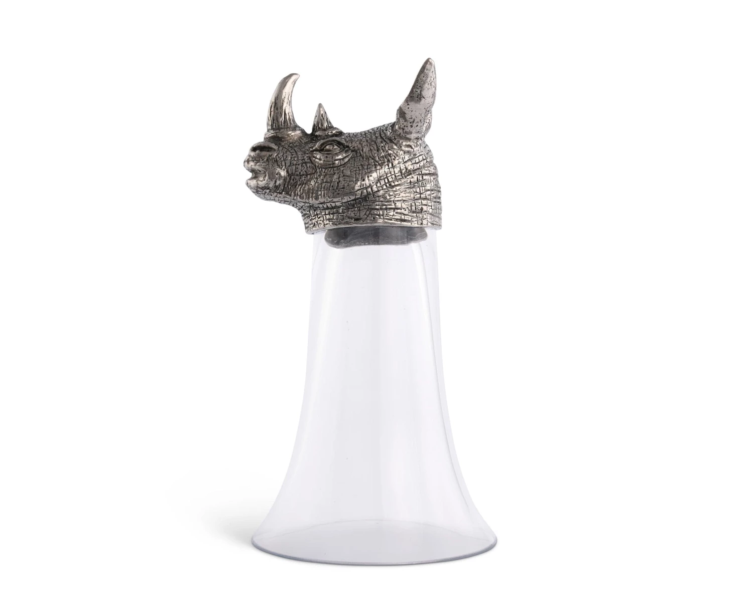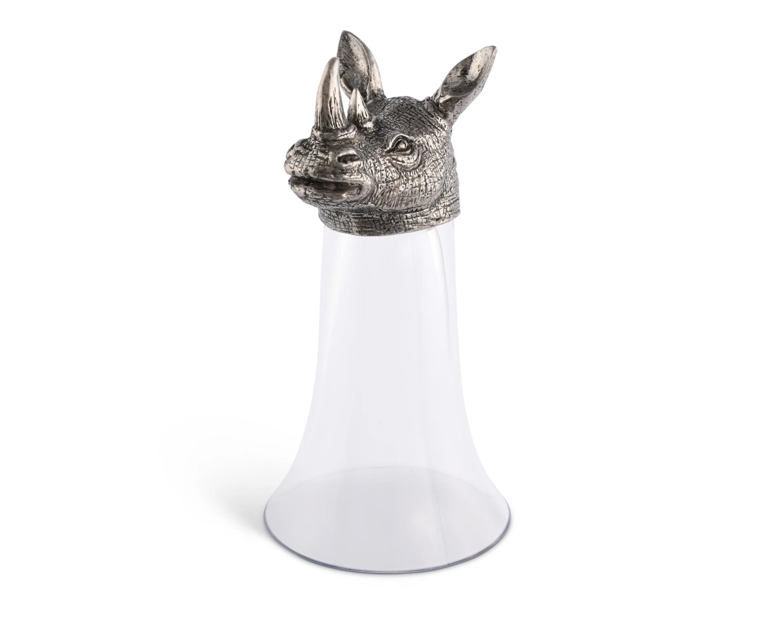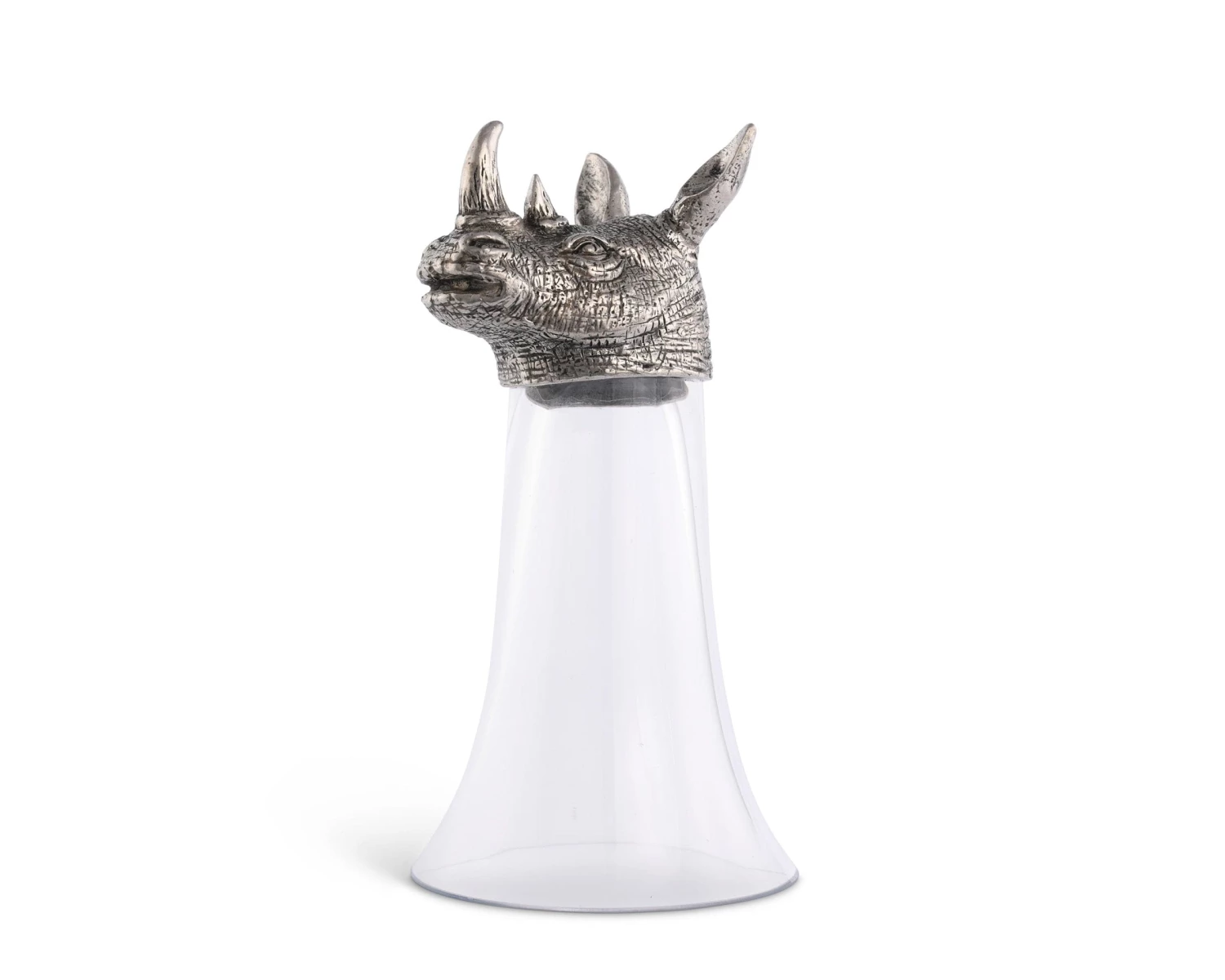 Vagabond House pewter is the secret to the rich detail on these clear glass stirrup cups crowned with a richly detailed, pewter figural head of a proud black rhinoceros. A critically endangered species, the black rhino has wandered Africa since pre-historic times.