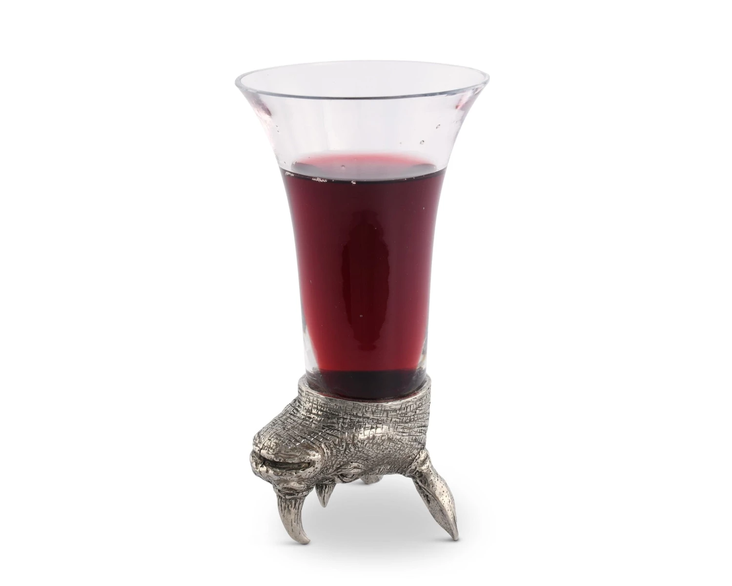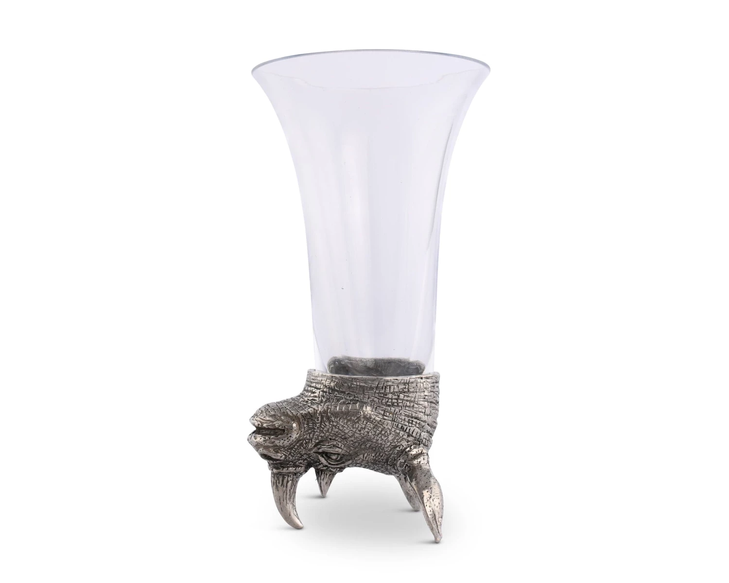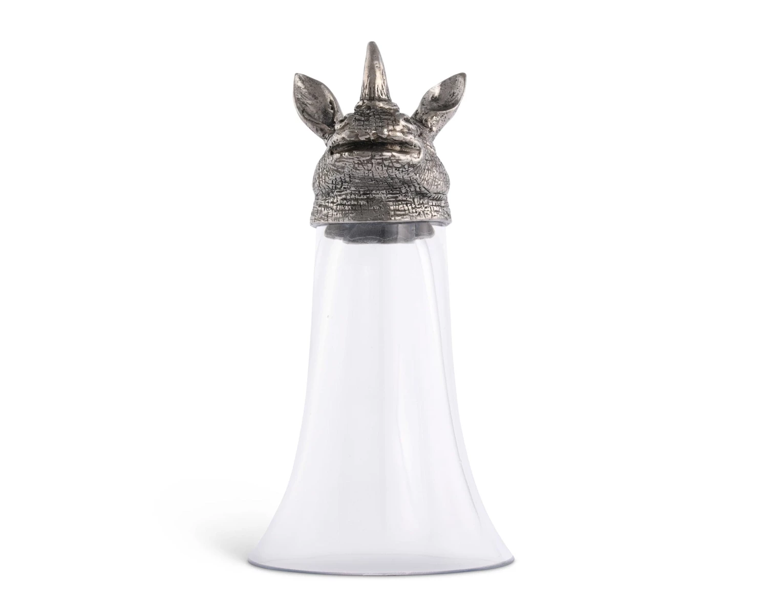 Vagabond House pewter is the secret to the rich detail on these clear glass stirrup cups crowned with a richly detailed, pewter figural head of a proud black rhinoceros. A critically endangered species, the black rhino has wandered Africa since pre-historic times.