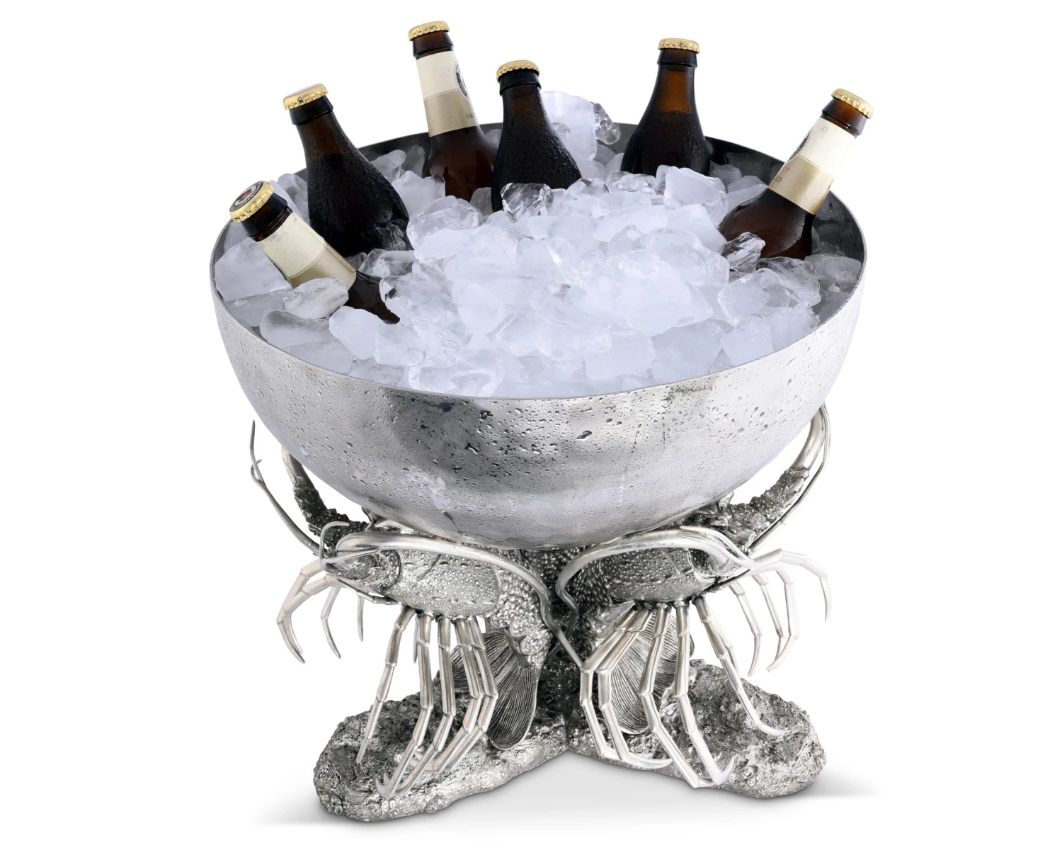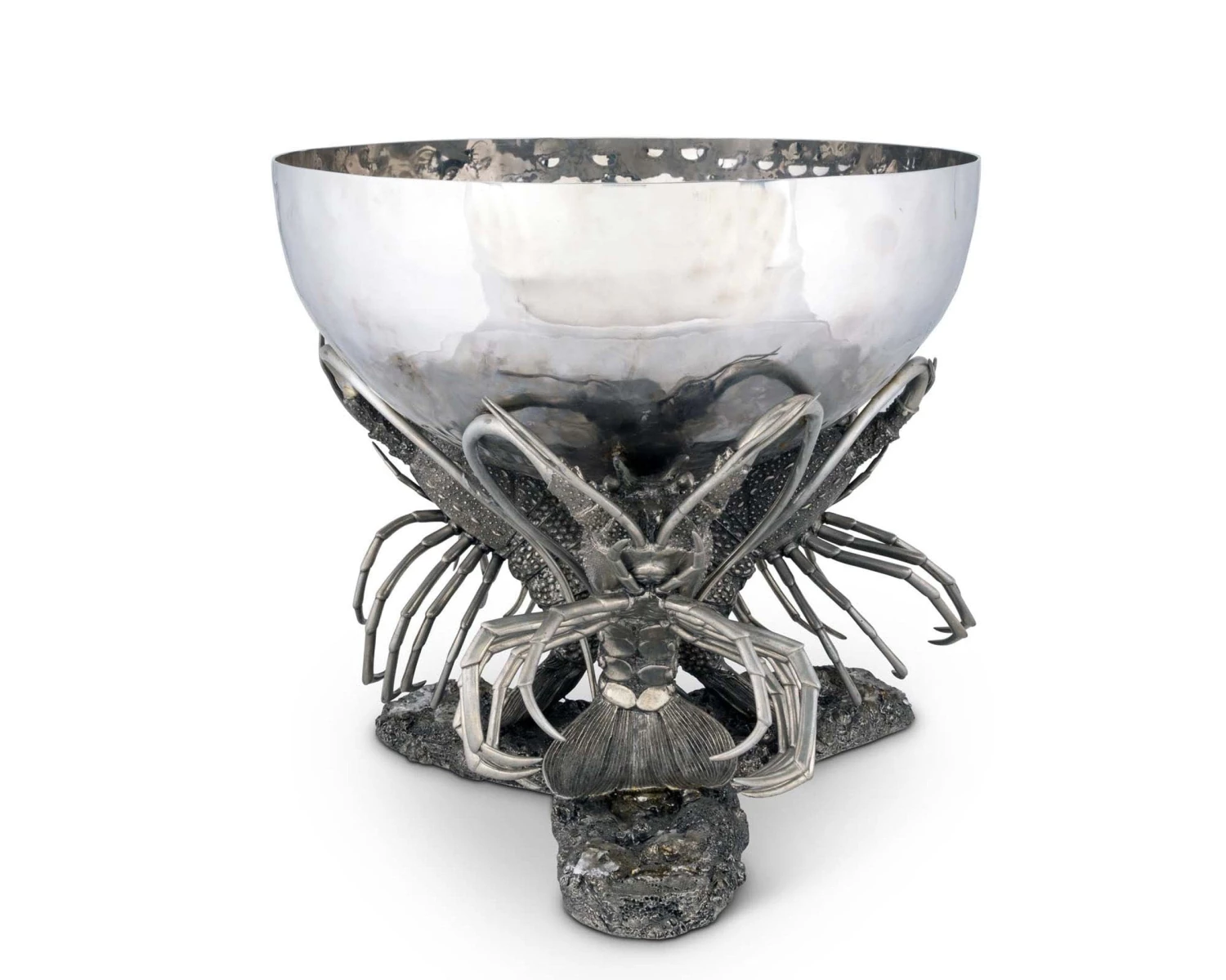 In Vagabond House’s pursuit to capture the essence of marine life, this Lobster Ice Tub supplies an ocean full of detail in its exquisite form. Handcrafted in our luxury pewter, three lobsters exhibit tremendous realism in their curved legs and long antennae. Perched on turbine-shaped rocks, the creatures extend their textured bodies up to support the stainless steel bowl in a brilliant display of definition and movement.