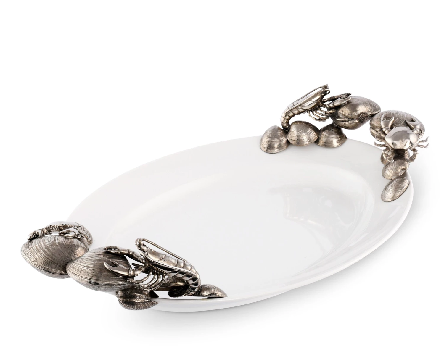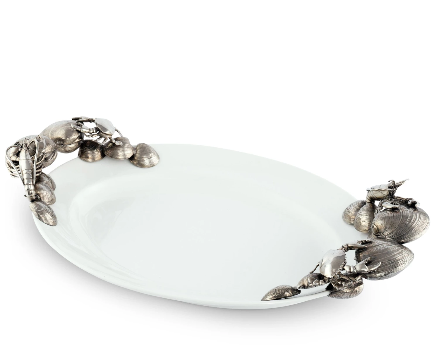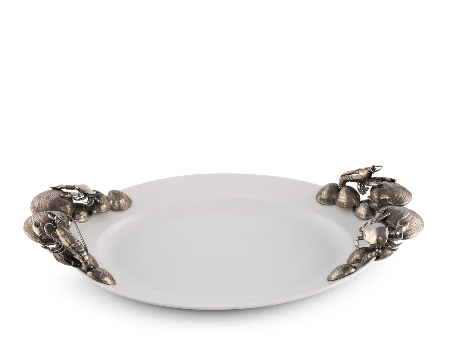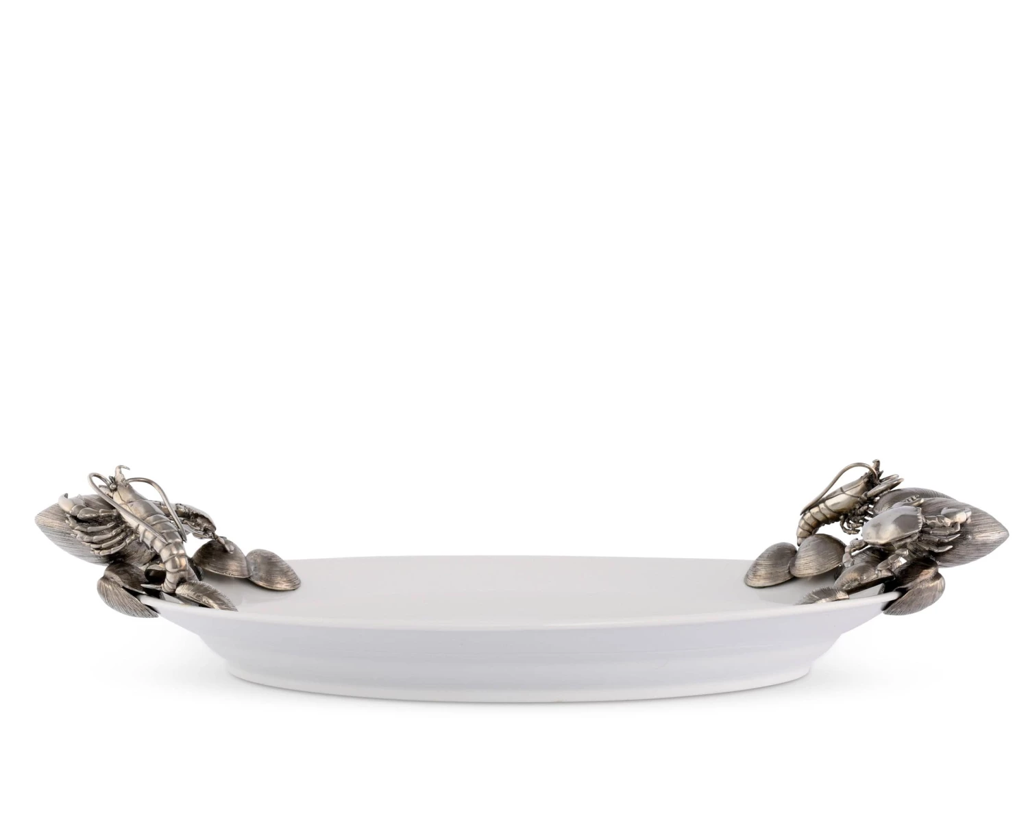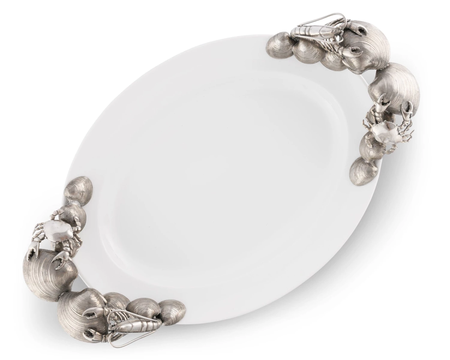 Crabs, cockles, clams and prawns, intricately and realistically detailed in pure Vagabond House pewter are clustered to form the handles of our large, lustrous oval Marine Life Stoneware Serving Tray.