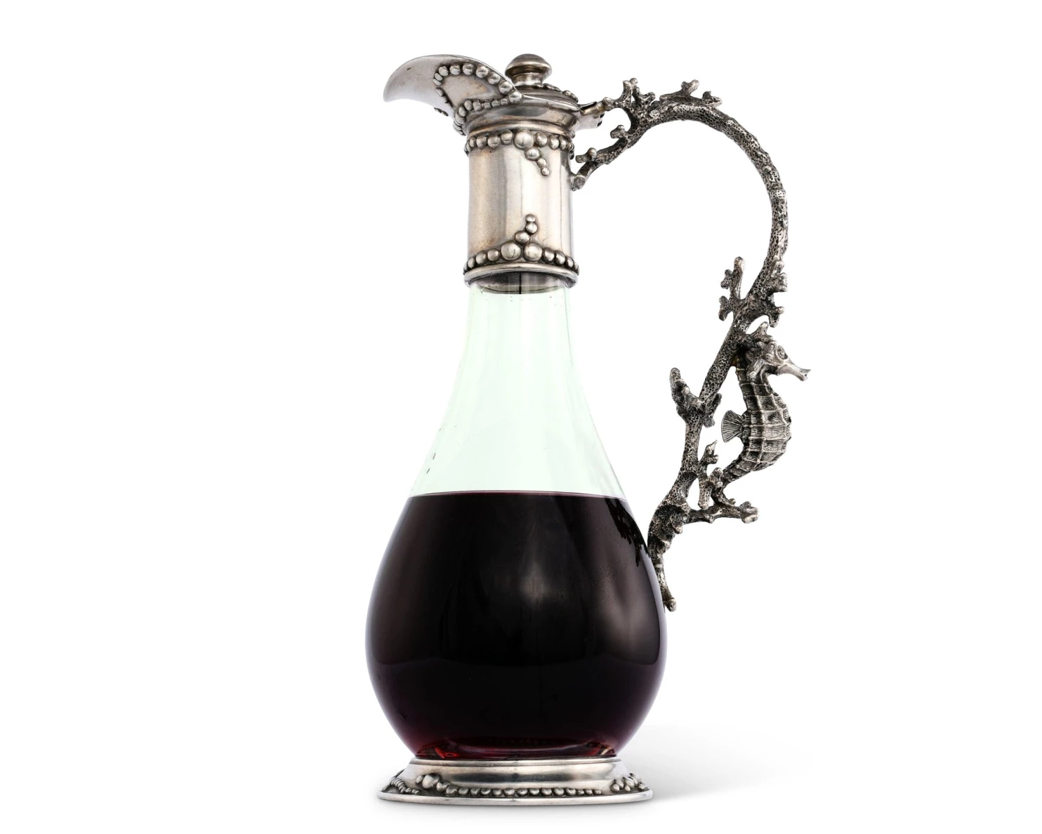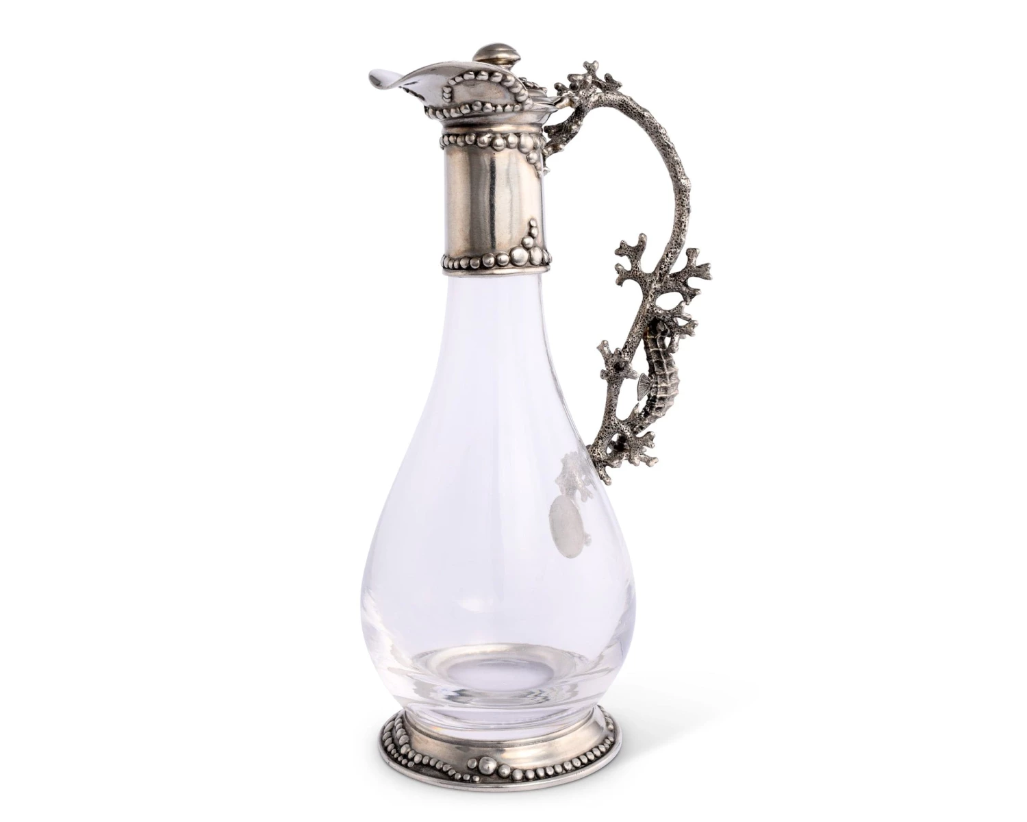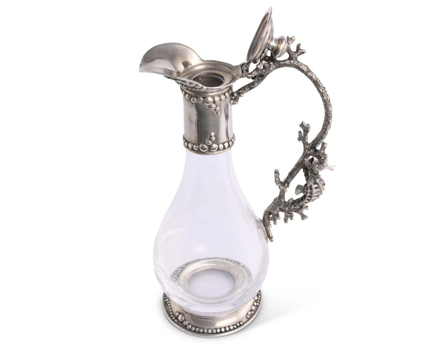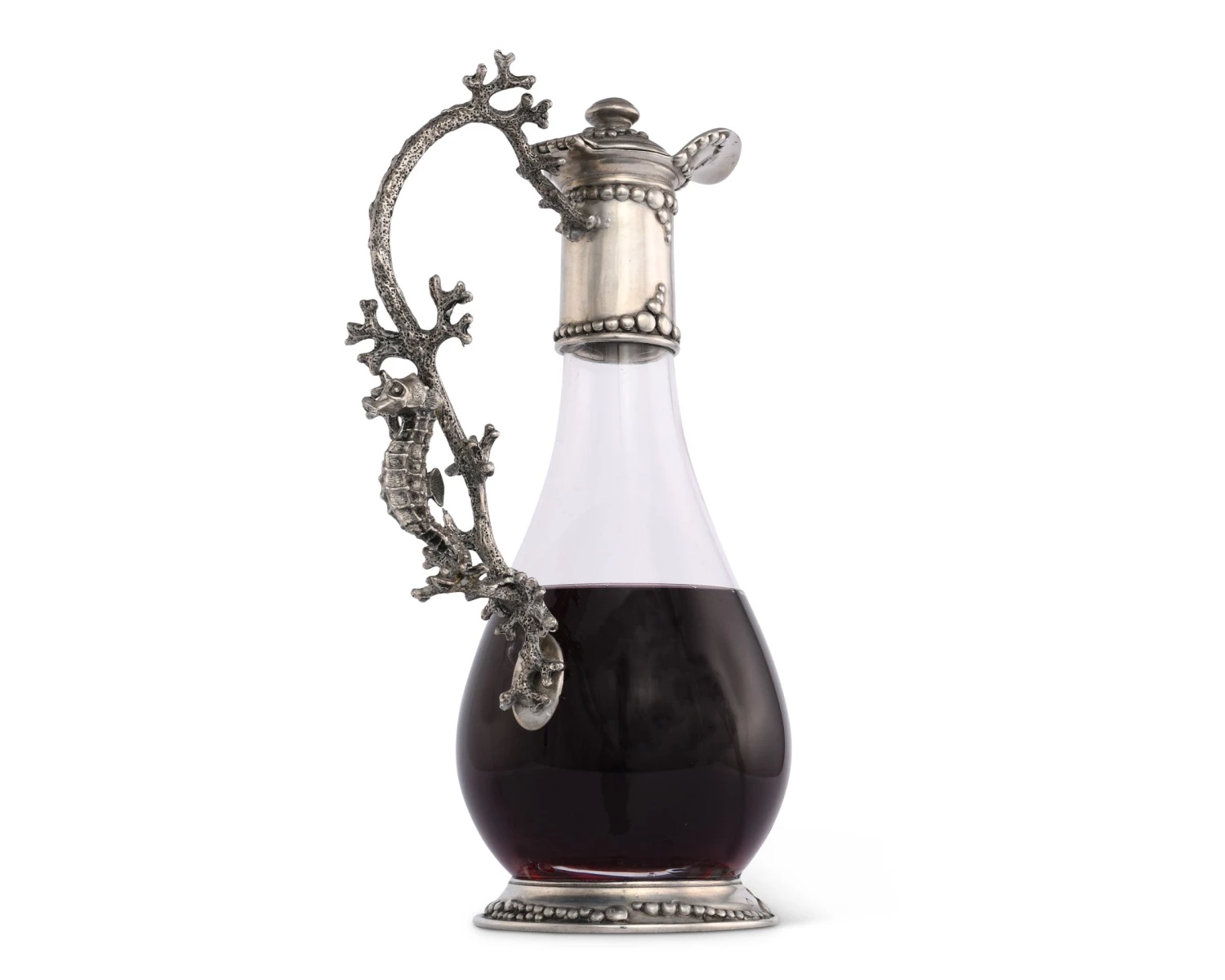 Inspired by Russian and French design of the late 1800’s, Vagabond House’s classic teardrop shaped glass and pewter wine decanter is embellished with a natural nautical motif.