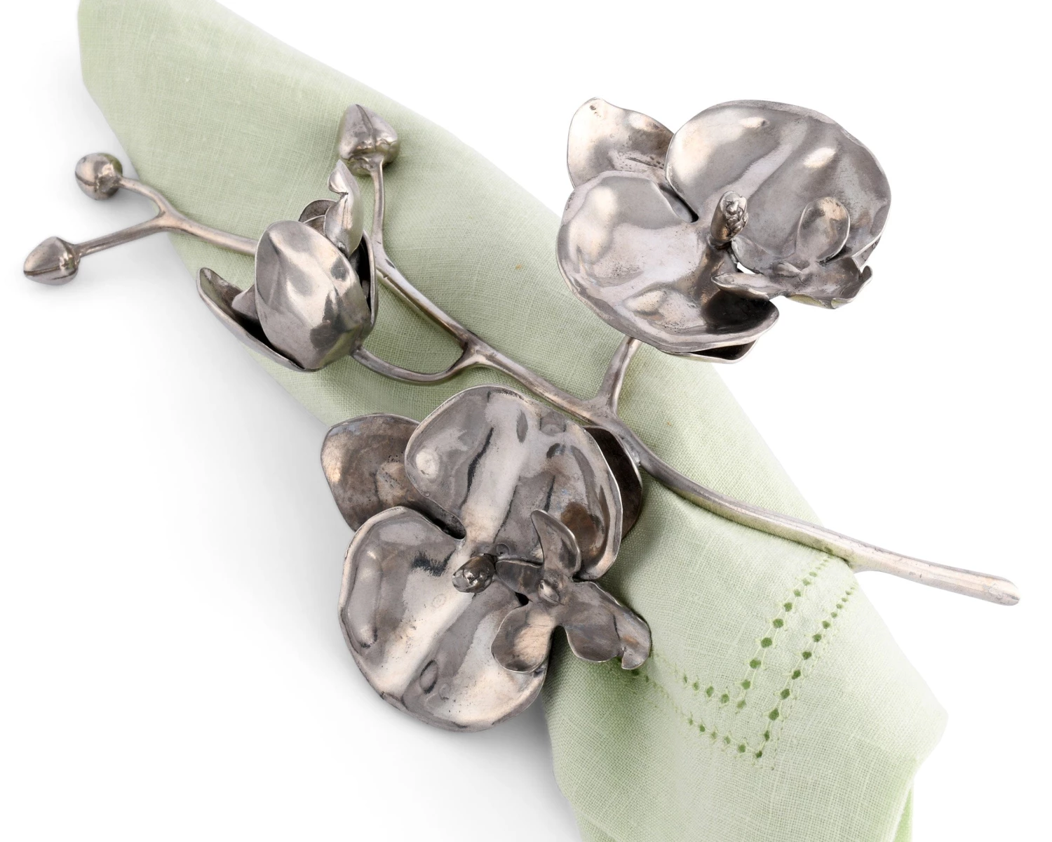 Our delicate, luxurious set of cast, polished pewter orchid napkin rings are perfect for any occasion requiring a beautiful table. Every entertainer knows the easiest way to start or finish a designed and inviting table or occasion is by choosing the perfect napkin rings.