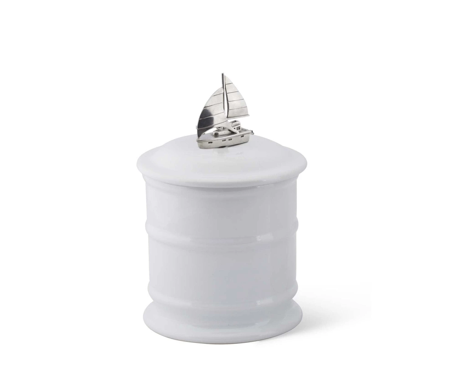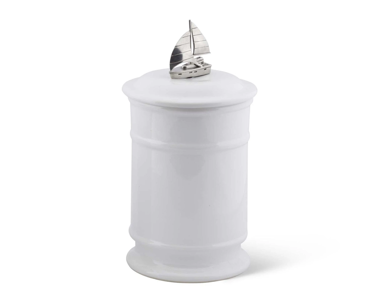 Vagabond House’s Sailboat Stoneware Canisters feature a delightfully detailed fully rigged cabin sloop finial that functions as a handle. The Canisters are crafted from fine stoneware, double hand-glazed and twice fired to a creamy, luminous finish. Available in 2 sizes.