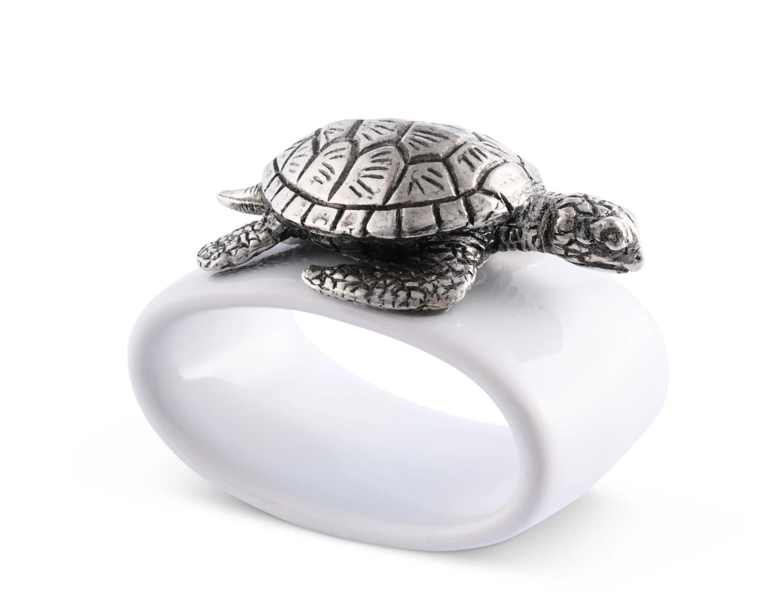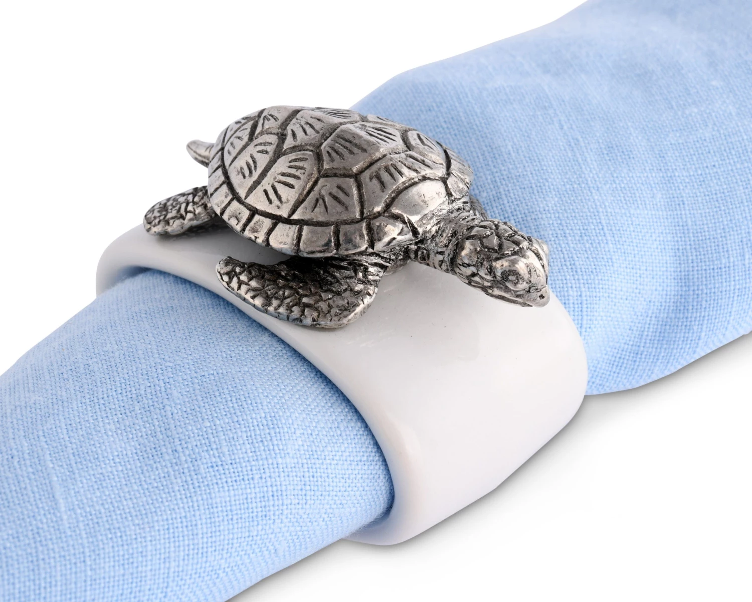 The extraordinary detail of the pewter Sea Turtle sunning atop Vagabond House’s Sea Turtle Stoneware Napkin rings is a testament to our designer’s attention to perfection. The lustrous stoneware rings are hand glazed and twice fired.