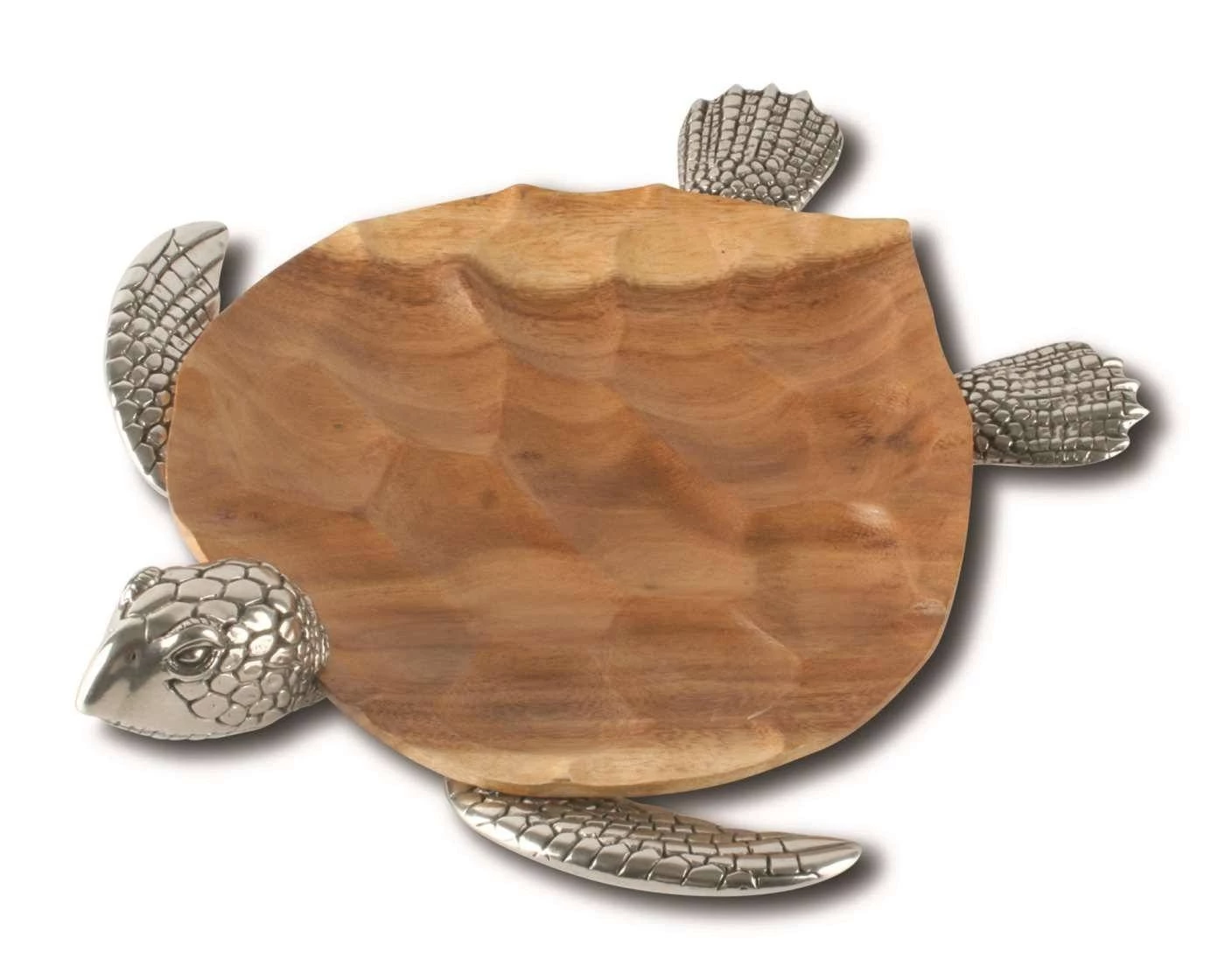 Exquisitely crafted of scalloped, burled Acacia Wood and cleverly finished with detailed Vagabond House pewter head and fins, our Sea Turtle Trays are artwork as well as beautiful functional serve ware. Sure to be remarked upon when used for service, the trays can also be displayed as unique wall décor anywhere you wish to share your marine style.