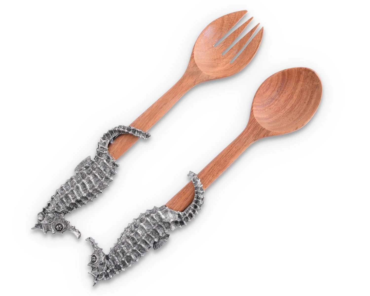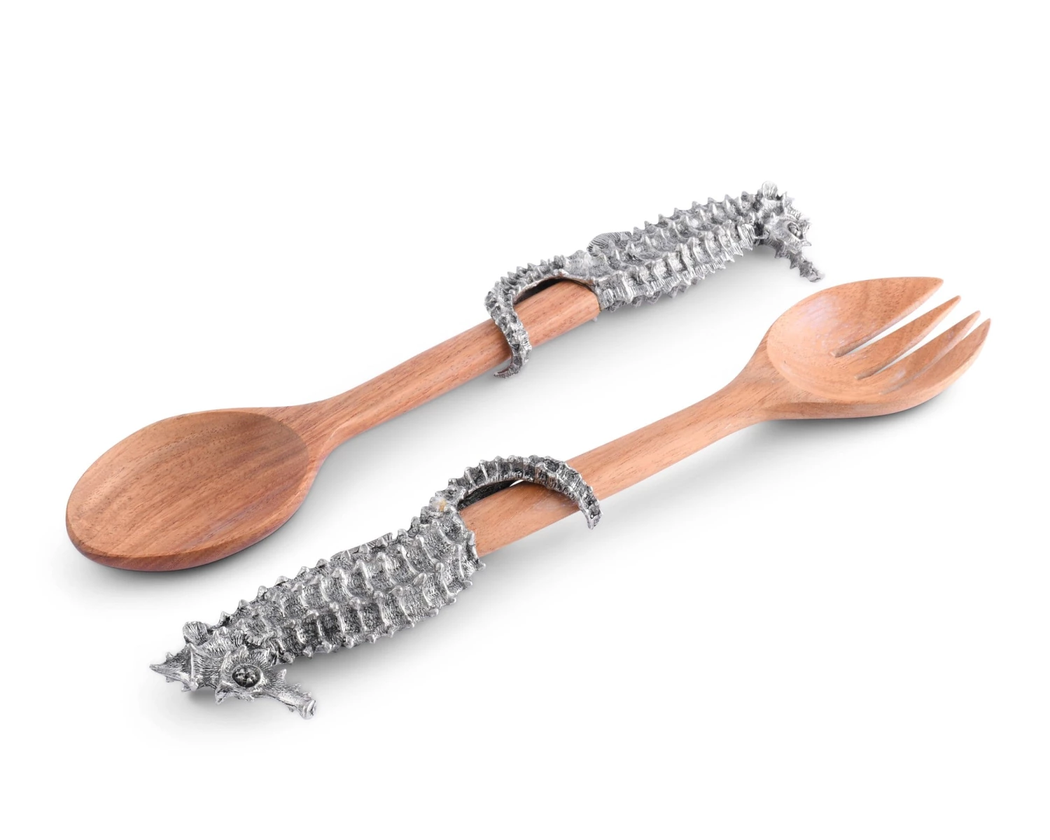 A detailed pair of seahorses curl around the hard acacia wood handles of our Sea and Shore Collection Salad Server Set. The servers are carved from acacia wood and hand-finished for excellence in form and durability. In Greek mythology the noble seahorse was known as Poseidon’s Steed and artworks throughout the ages depict Hippocampus (mythological seahorses) pulling Poseidon’s chariot.