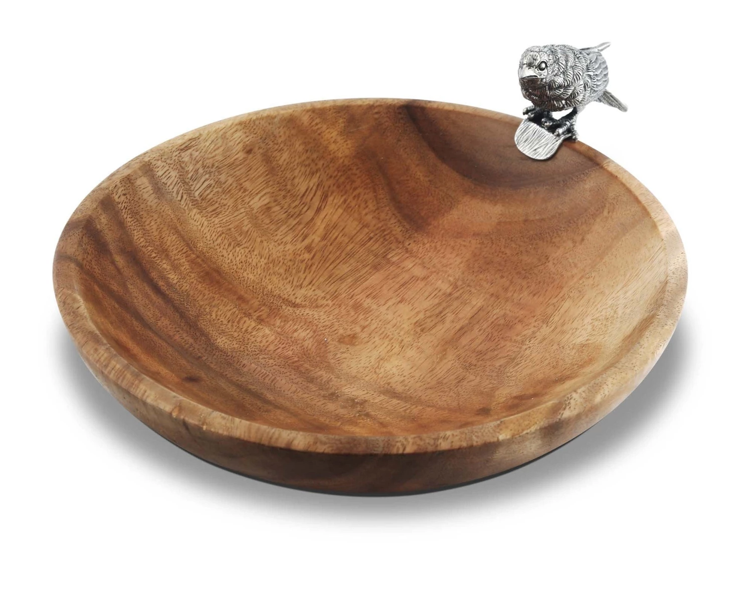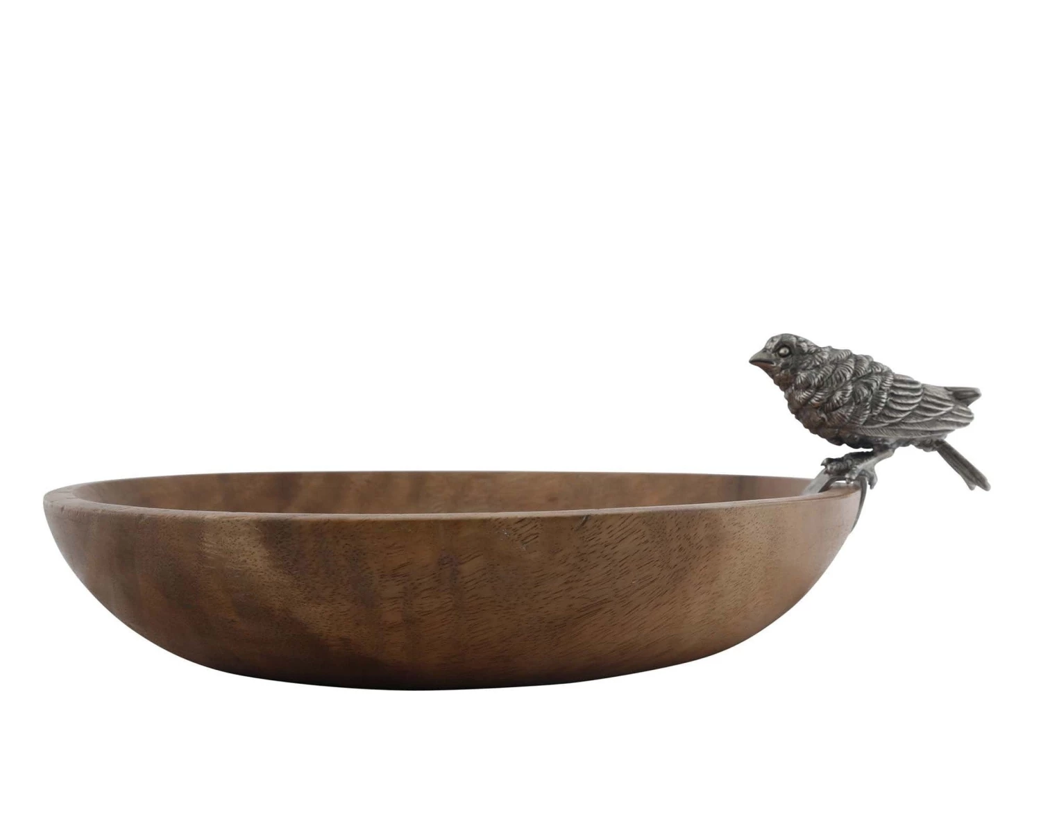 Vagabond House signature pewter song bird perches on a naturally striated, shallow acacia tray, ready to nibble whatever delights you are serving. The lovely acacia tray is hand turned and finished with food safe dye and oil, the pewter song bird decoration is hand-finished.