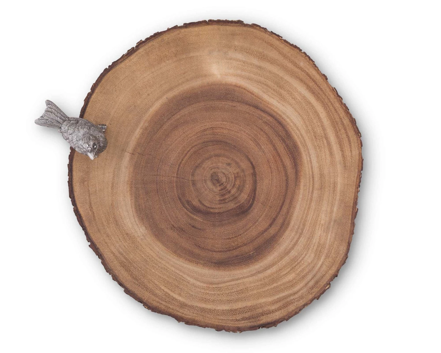 Unique, sweet and rustically charming, this stand brings a touch of natural whimsy to your table. Crafted from slab cut acacia logs, the natural wood stand has a 1.5 inch riser foot below. A mini Song Bird statue in luxury pewter perches on the stand, so realistically detailed, your guests might worry he will peck their fingers!