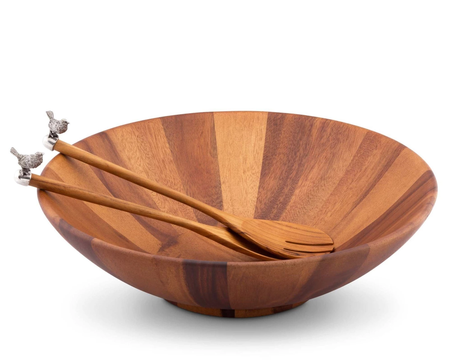 Vagabond House’s gift ready Songbird Salad Bowl Set includes a hand-turned wok style bowl crafted in hard, long wearing Acacia and two matching salad servers. A petite pewter songbird adorns the handle of both the fork and the spoon style server. The cool tones of the luxury pewter songbirds contrast beautifully with the warm chatoyancy of the golden Acacia.
