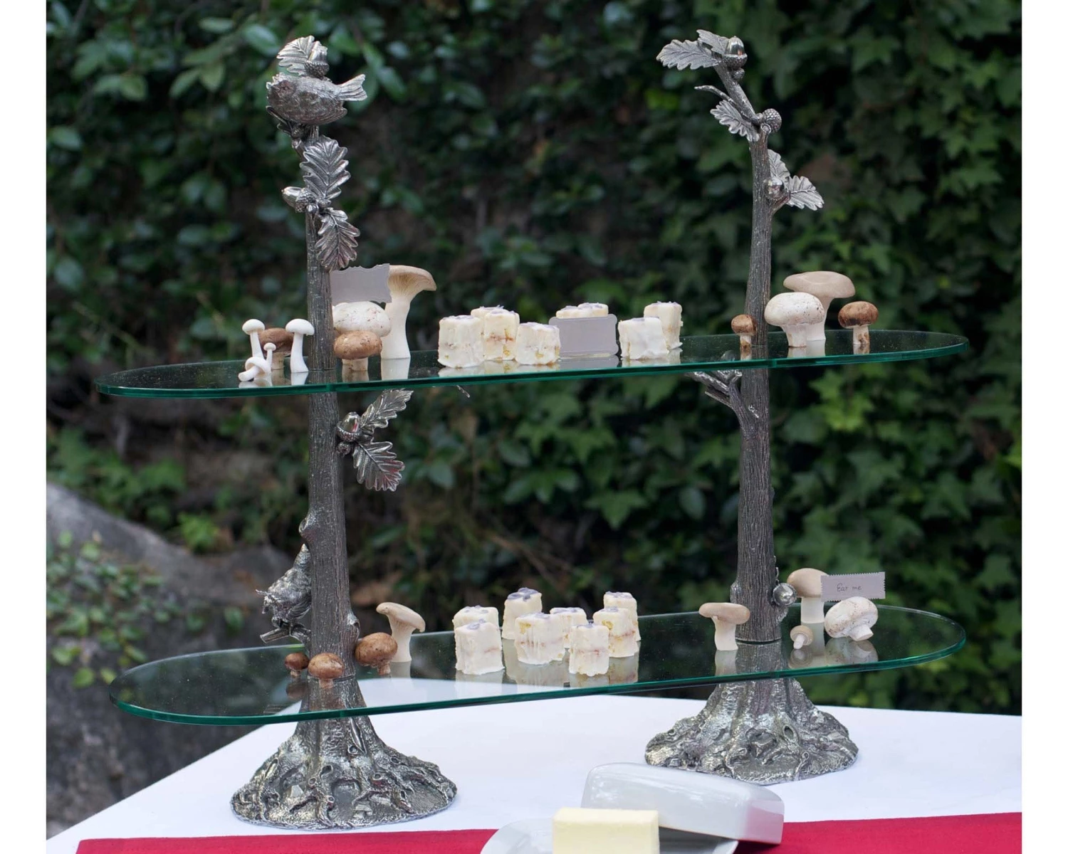 Vagbaond House’s Song Bird Bistro Stand features 2 generously sized glass shelves supported by intricately detailed cast pewter oak tree columns. Each column is unique in embellishment, with song birds perched on branches along with acorns and oak leaves adorning the majestic Oak tree columns.