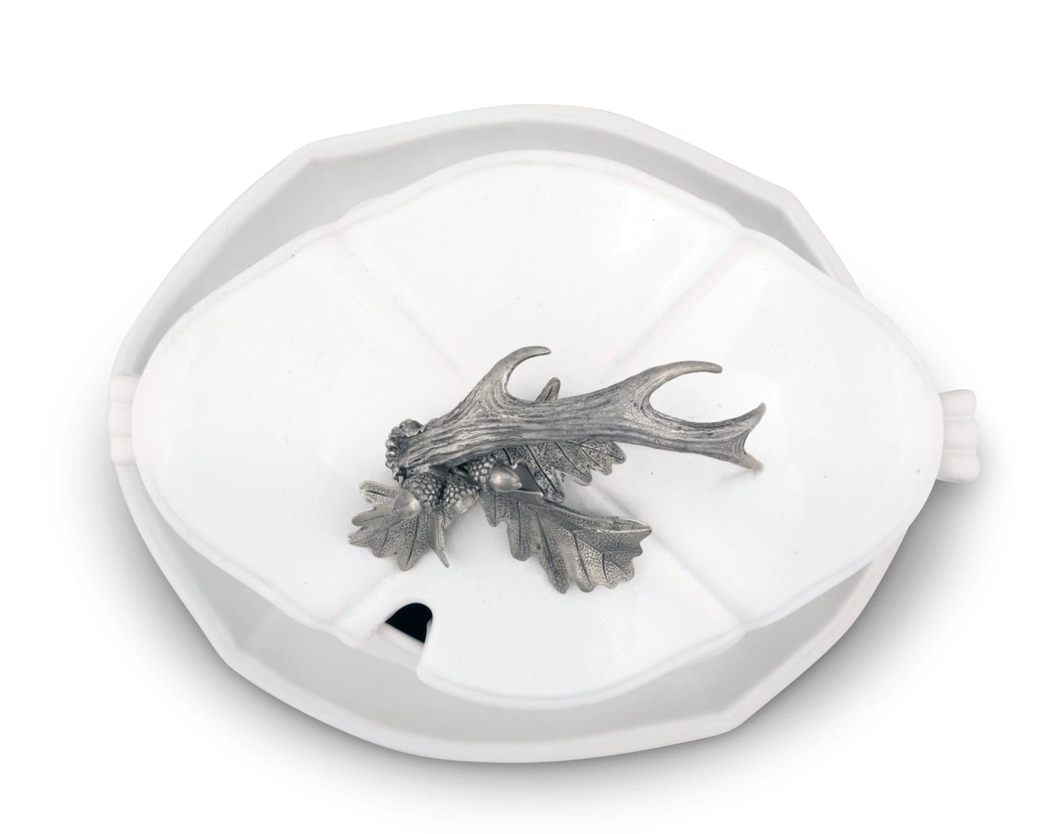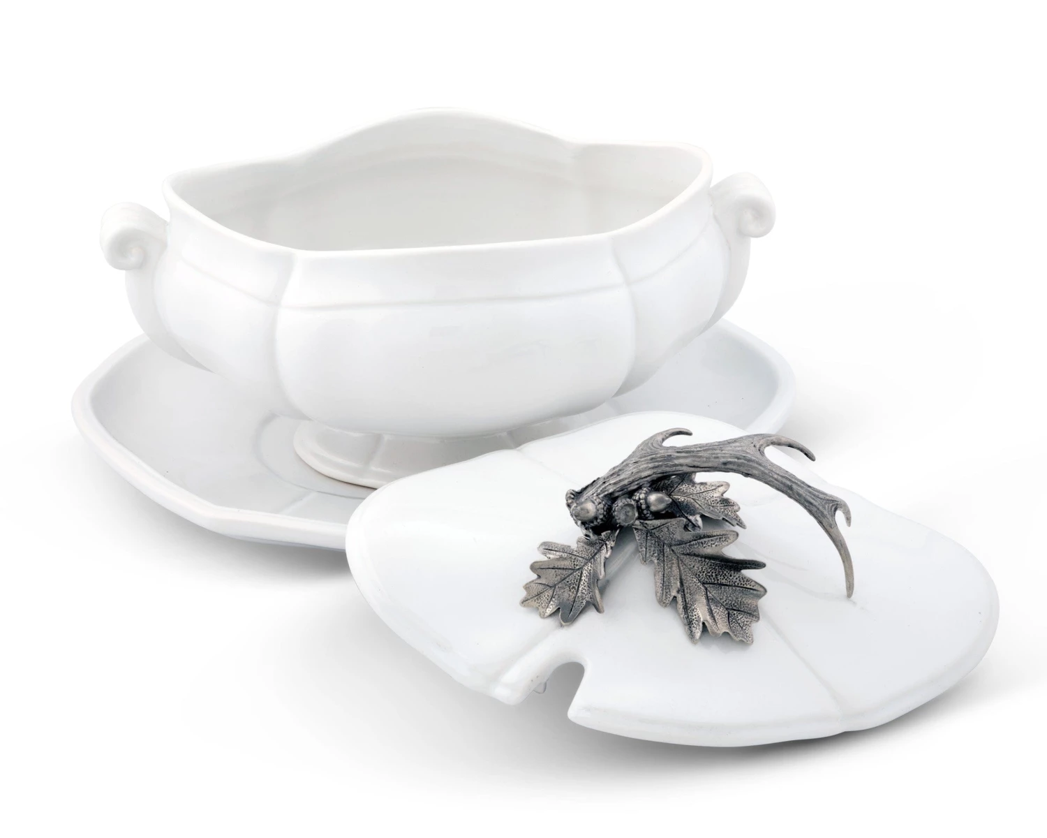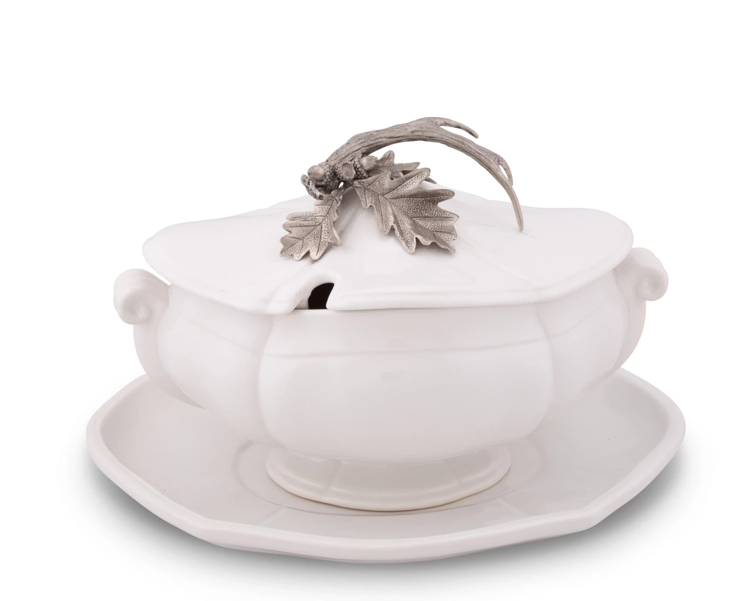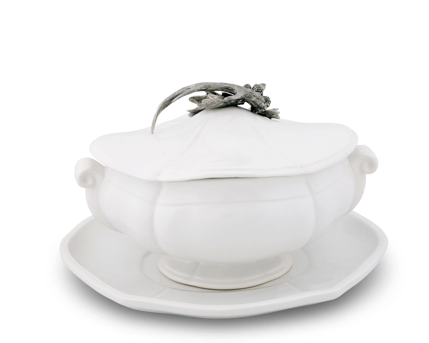 Vagabond House’s Fallen Antler Tureen serves your favorite soups and stews in dramatic style. A stoneware ensemble with a saucer plate and lid featuring a detailed pewter finial art of an antler gathered from the forest floor. Finished with a spray of oak leaves and tiny acorns under the antler.