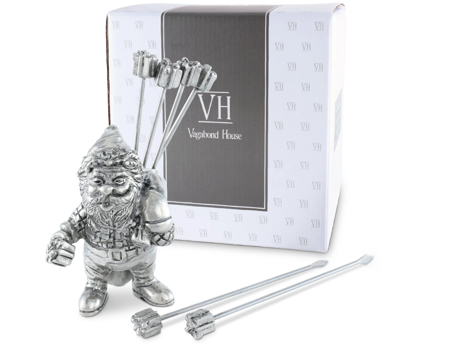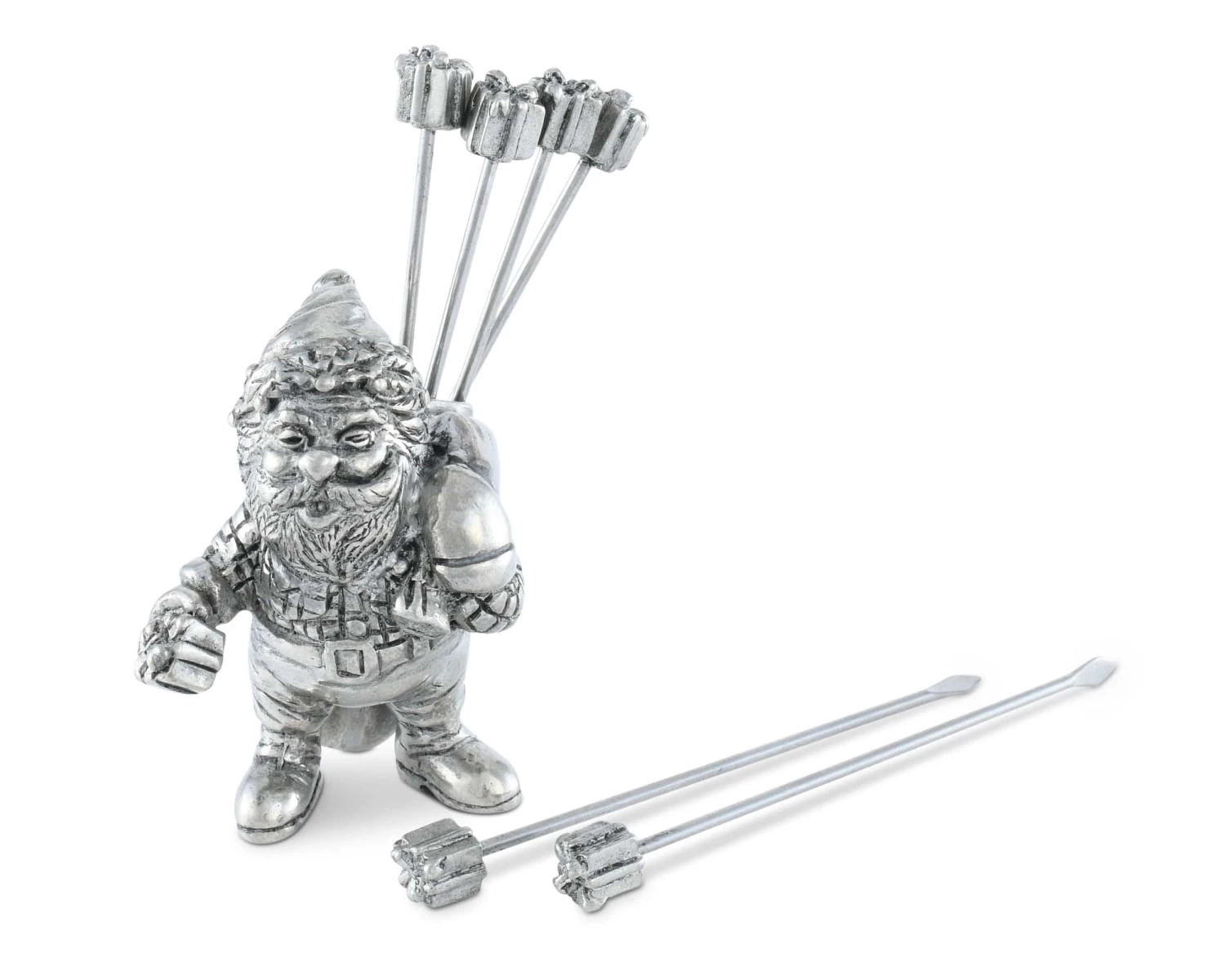 Presents come neatly gift wrapped at the top of cheese picks in Vagabond House’s St. Nick Set. Crafted in luxury-grade pewter, our flannel-clad Santa carries the six picks in a large sack slung over his shoulder. Featuring large mittens and an additional package in one hand, St. Nick brings holiday spirit to your table as he bellows ho-ho-ho through his open mouth.