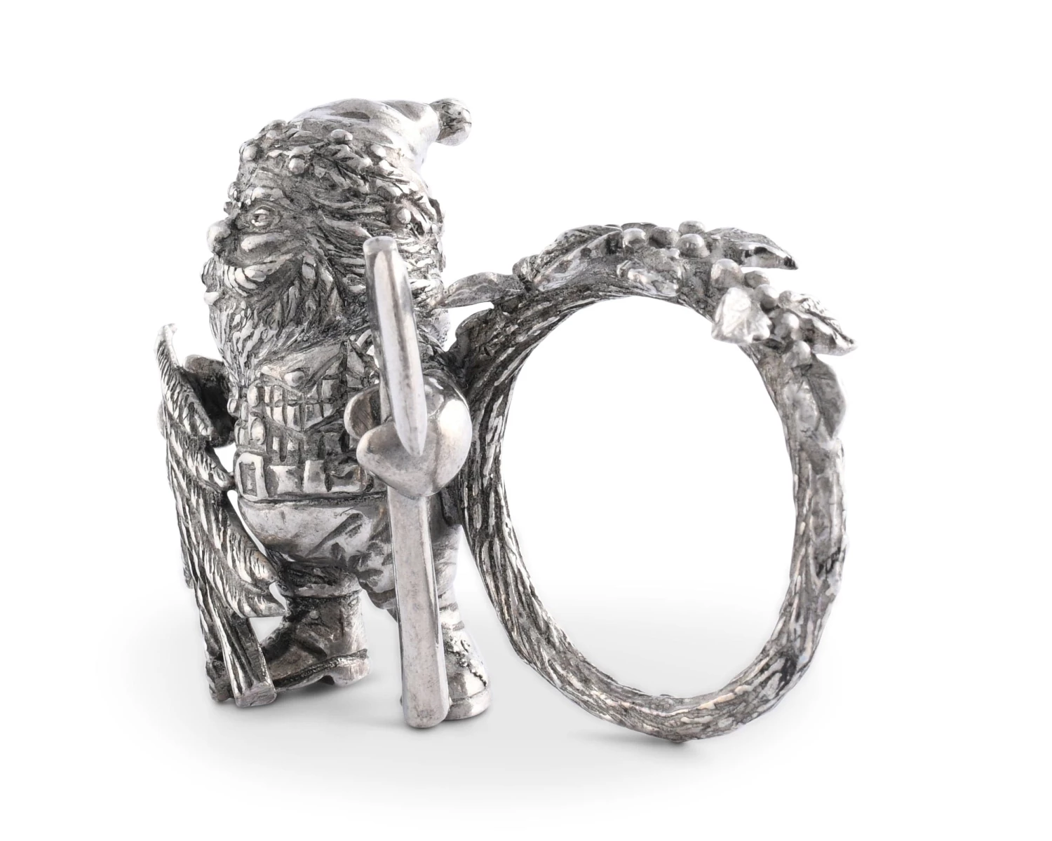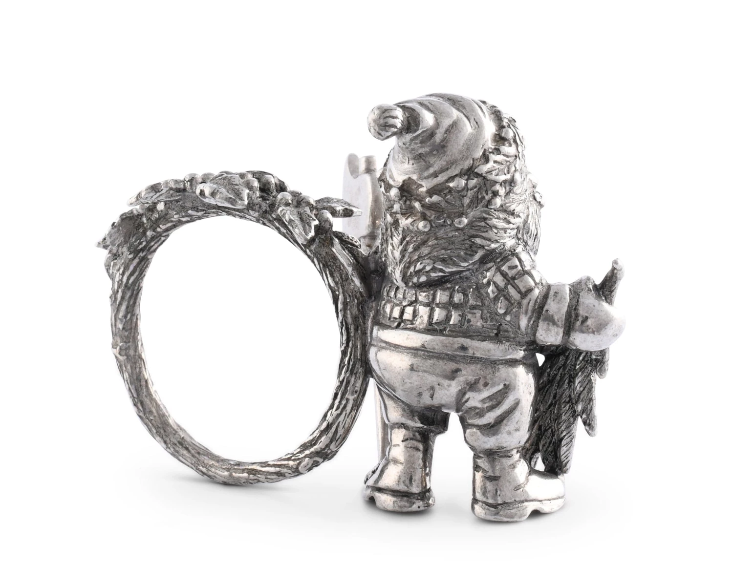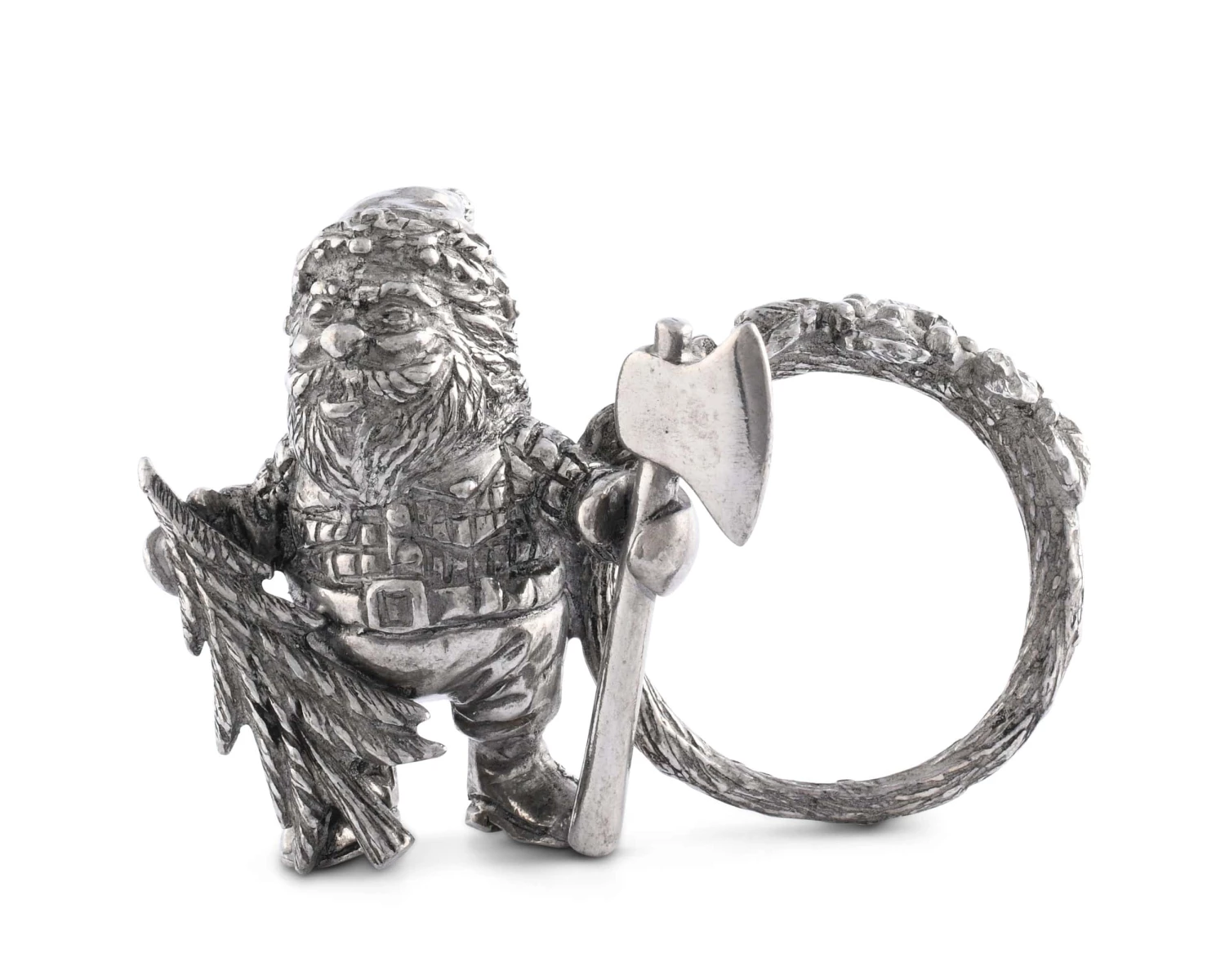 Give your table accents a rugged elegance with Vagabond House’s St. Nick Napkin Ring. Our woodsman Santa Claus sports a detailed flannel, pointy hat and large belt buckle as he carries a miniature evergreen and ax in either hand. Featuring exquisite berries and leaves on the rim, a gorgeous holly wreath extends off St. Nick’s pewter body to create the stylish napkin ring.