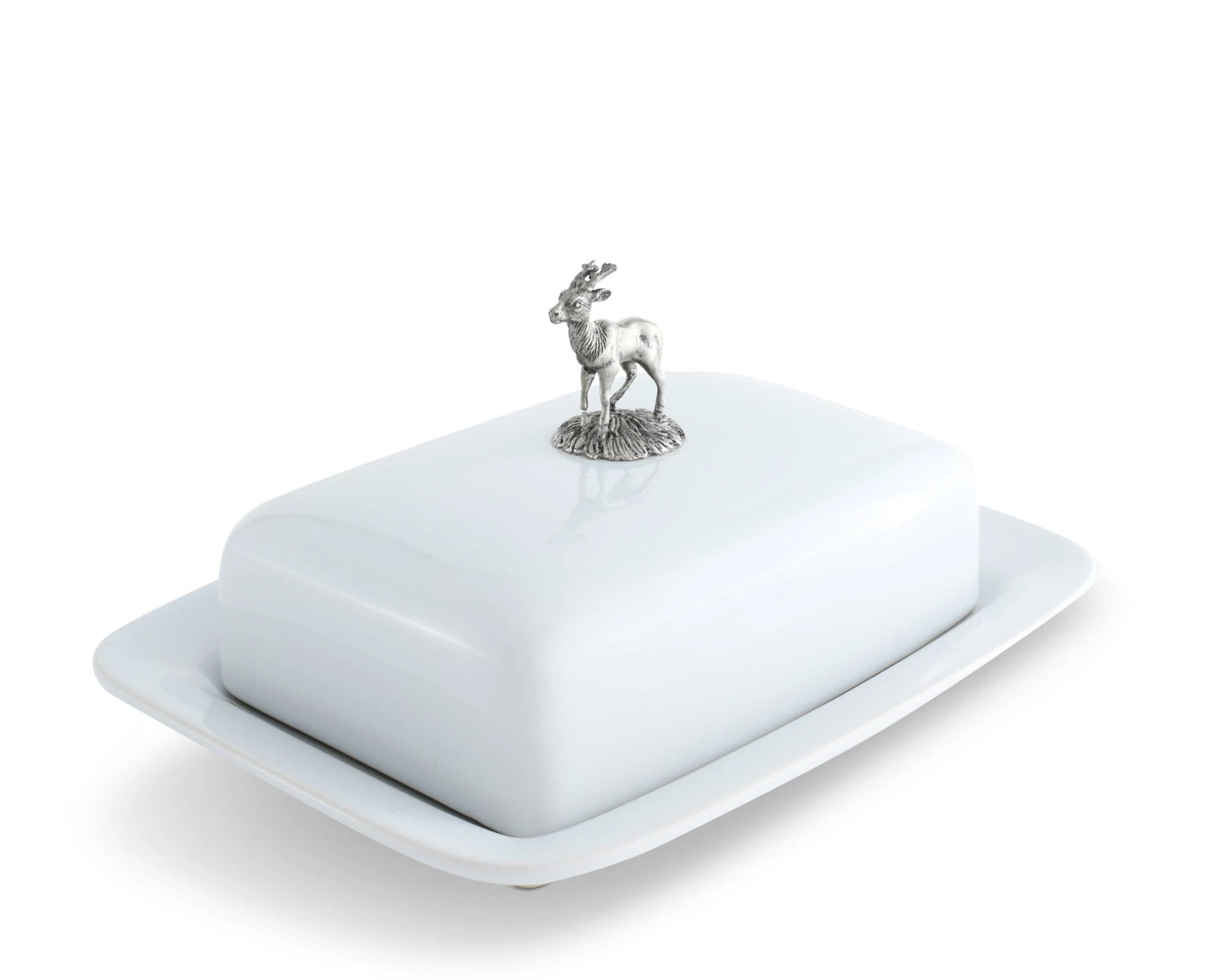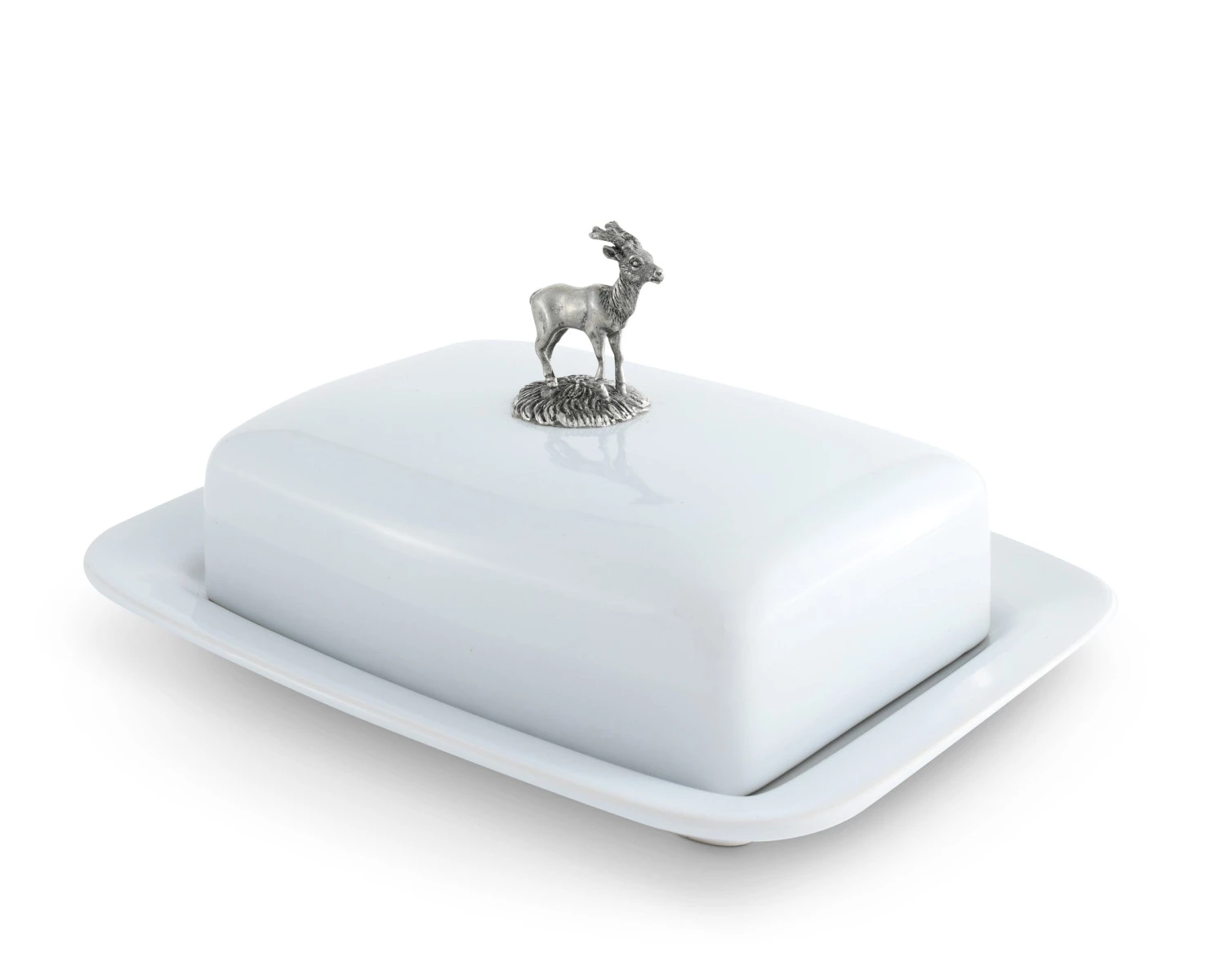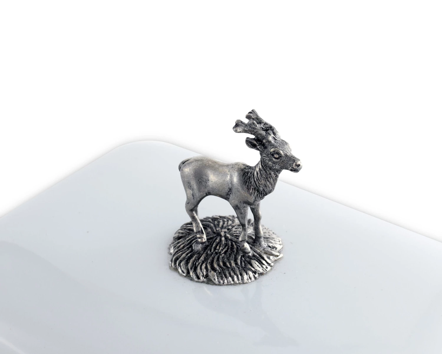 Serving as both an accent and a handle, our magnificent, pure-pewter stag graces the top of this Vagabond House butter dish. Standing atop figural rock, the creature displays remarkable definition in its layered fur and antlers as it starts off into the distance. Our elegant, hand-finished stoneware brings out the detail in this statuette.