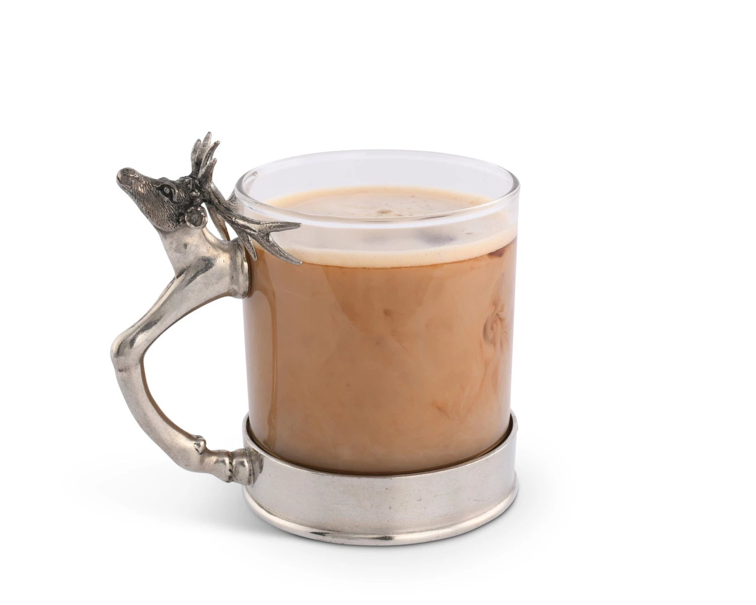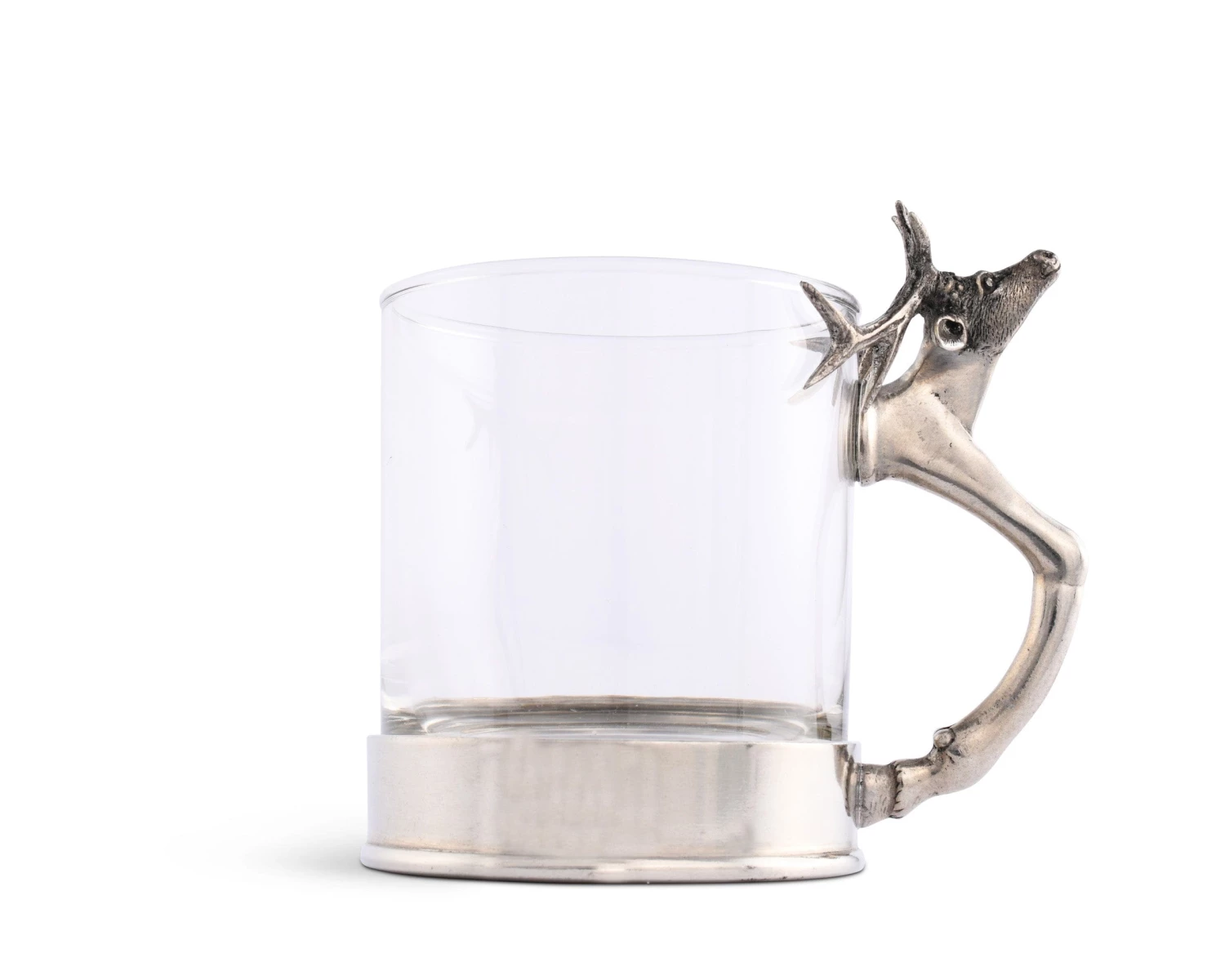 The modern styling on our each straight sided short beverage glasses is enhanced by the unique pewter detail of the stag leg and head crafted handle. The glass rests on a well weighted pewter base. When you serve fine beverages in these unusual glasses, great conversation is sure to follow.