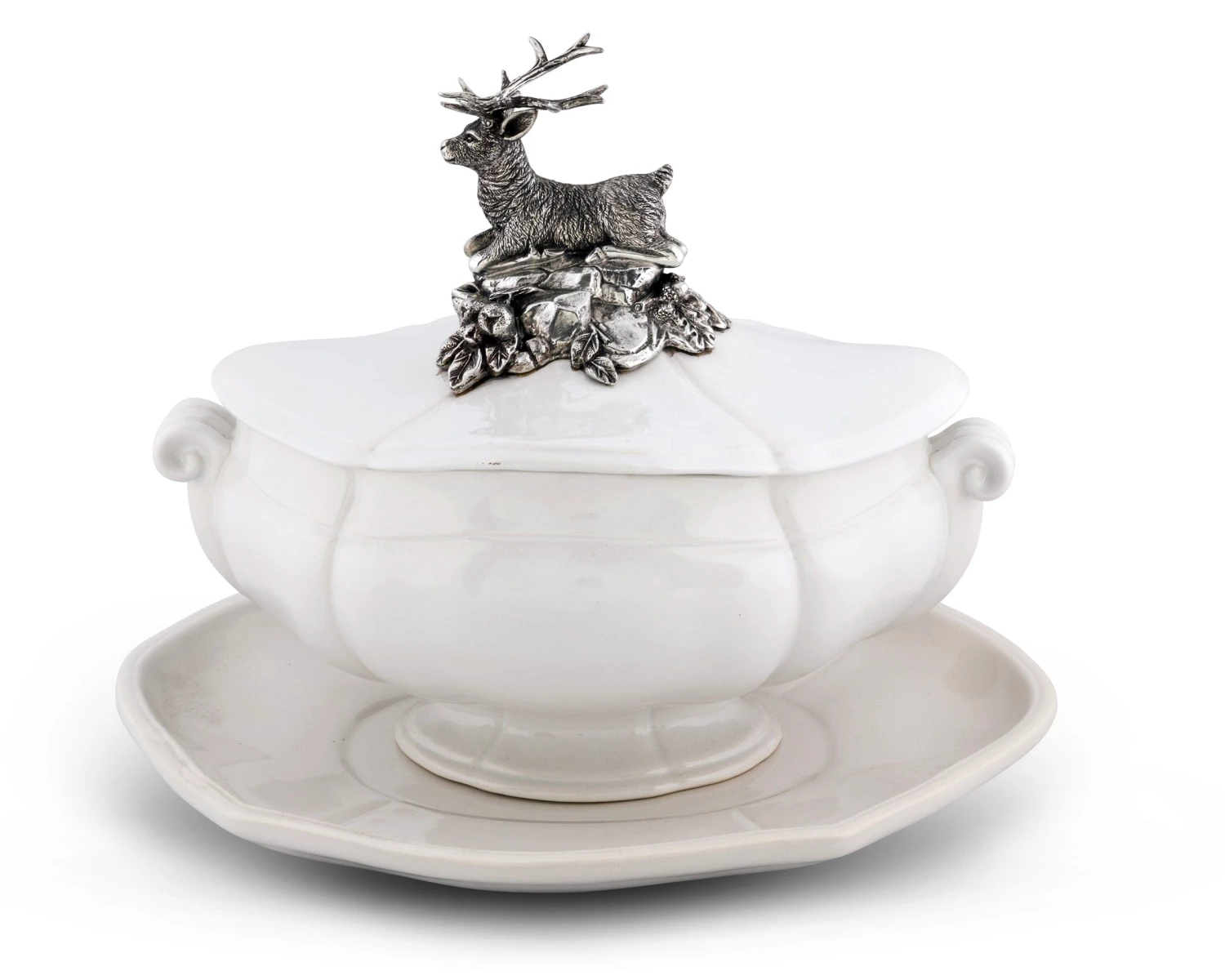 A miniature artwork of luxury pewter forms the finial handle on our lidded soup tureen. A proud stag rests on a rocky mountain outcropping surrounded by a scattering of acorns and oak leaves, extravagantly detailed and lovely to behold.