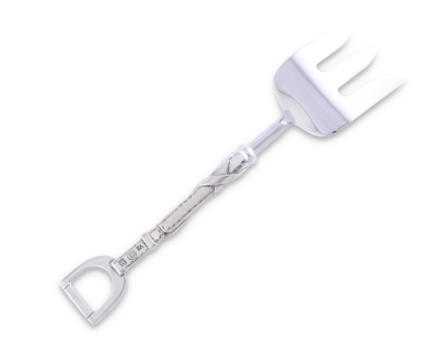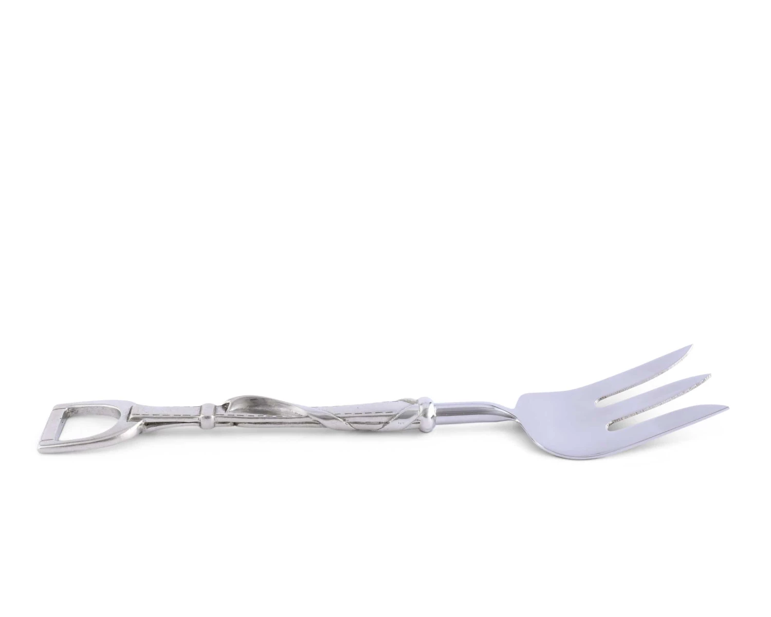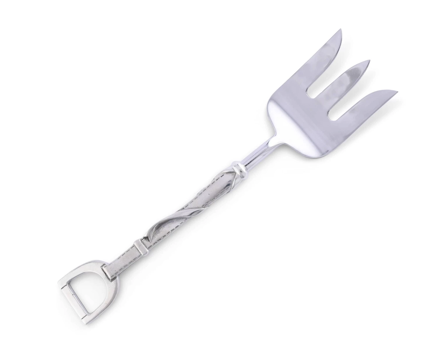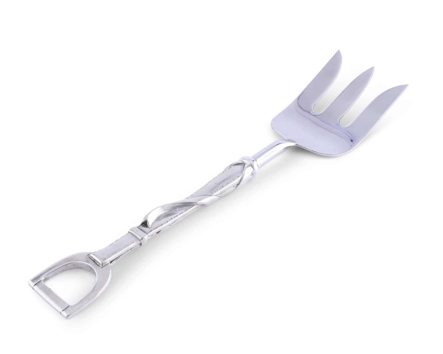 What to say about Vagabond House’s Stirrup Pattern Serving Fork? A sturdy, wide stainless steel fork head makes serving almost anything a quick and easy job. Attaching the handy head to a luxury pewter handle featuring detailed tooled, buckled stirrup leather and straps ending in a classic stirrup iron makes it classically Vagabond House.