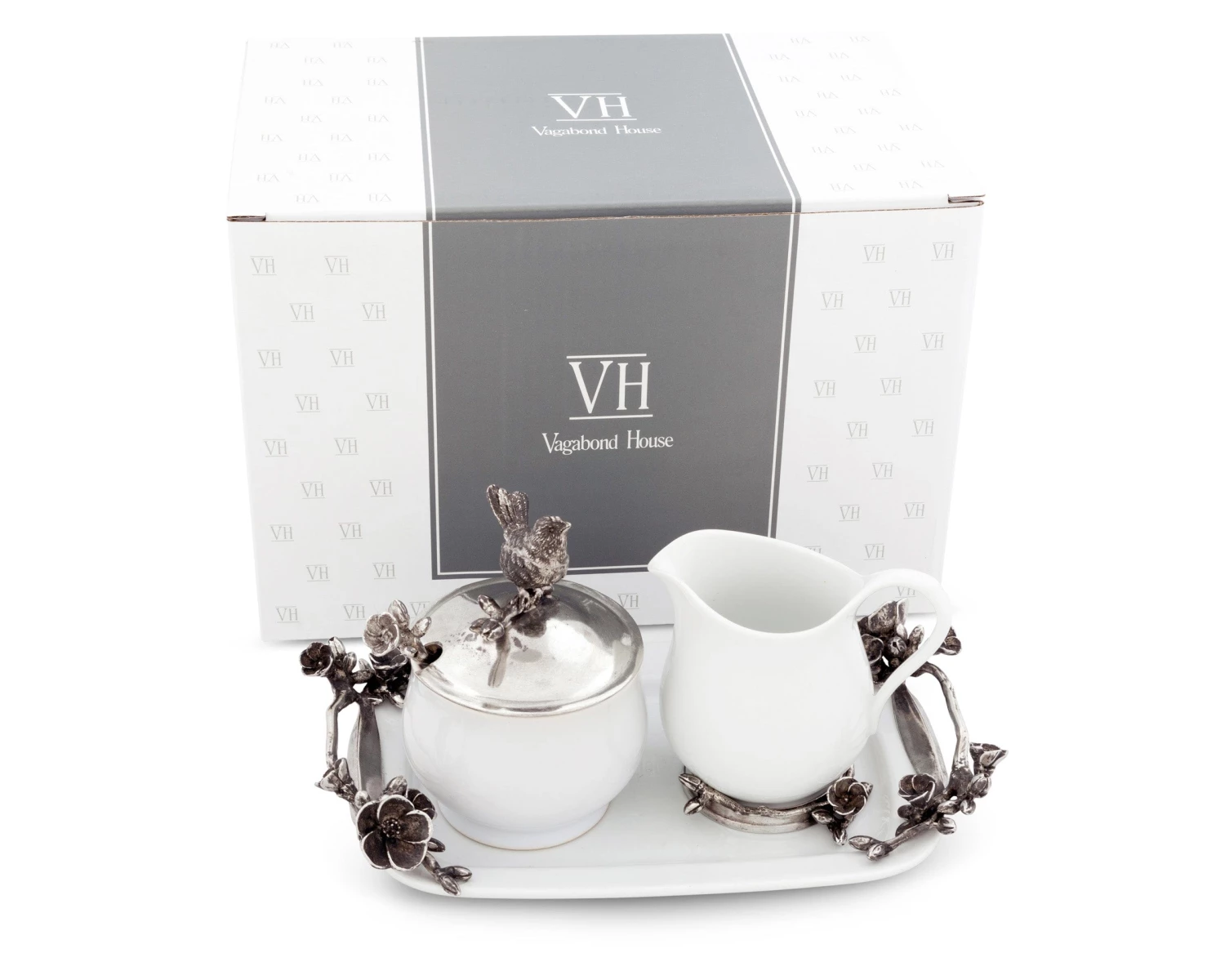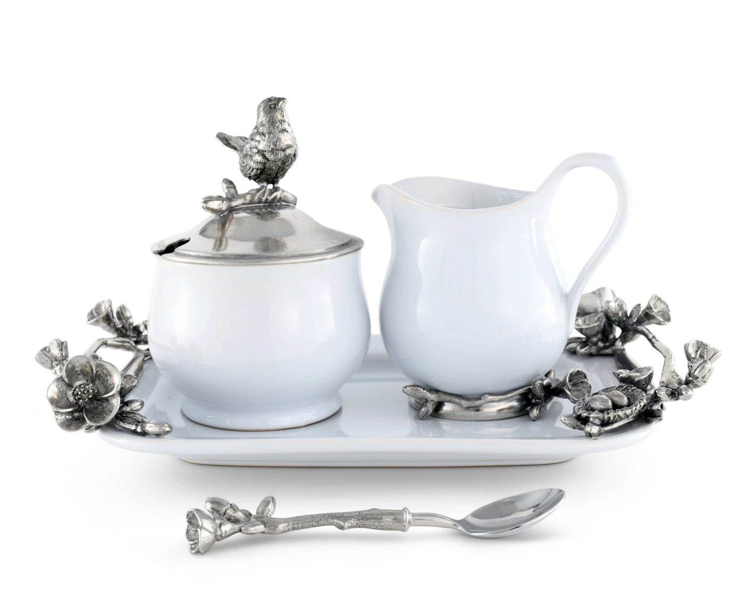 The cream pitcher, sugar bowl and decorative tray are crafted in lustrous fine white stoneware and embellished with delicately detailed pewter. A figural song bird perches on the pewter lid of the sugar bowl, the pewter tray handles are adorned with blooms and nested song bird eggs.