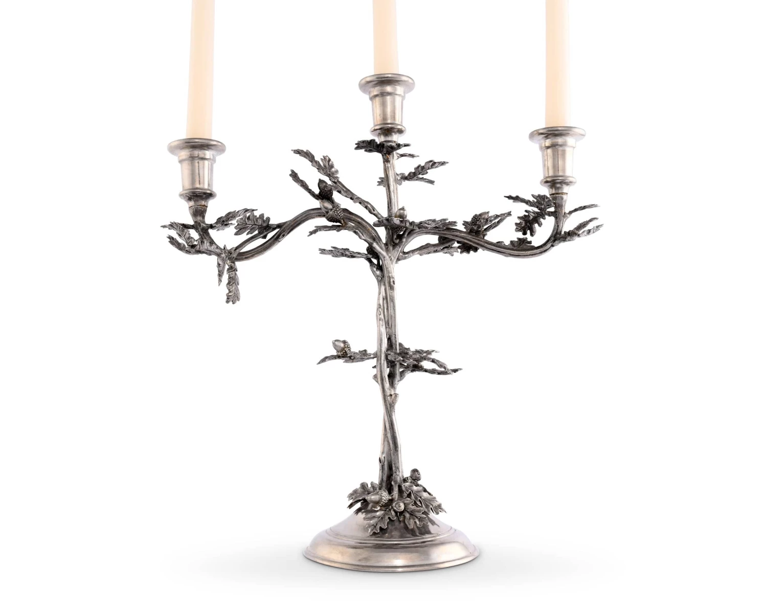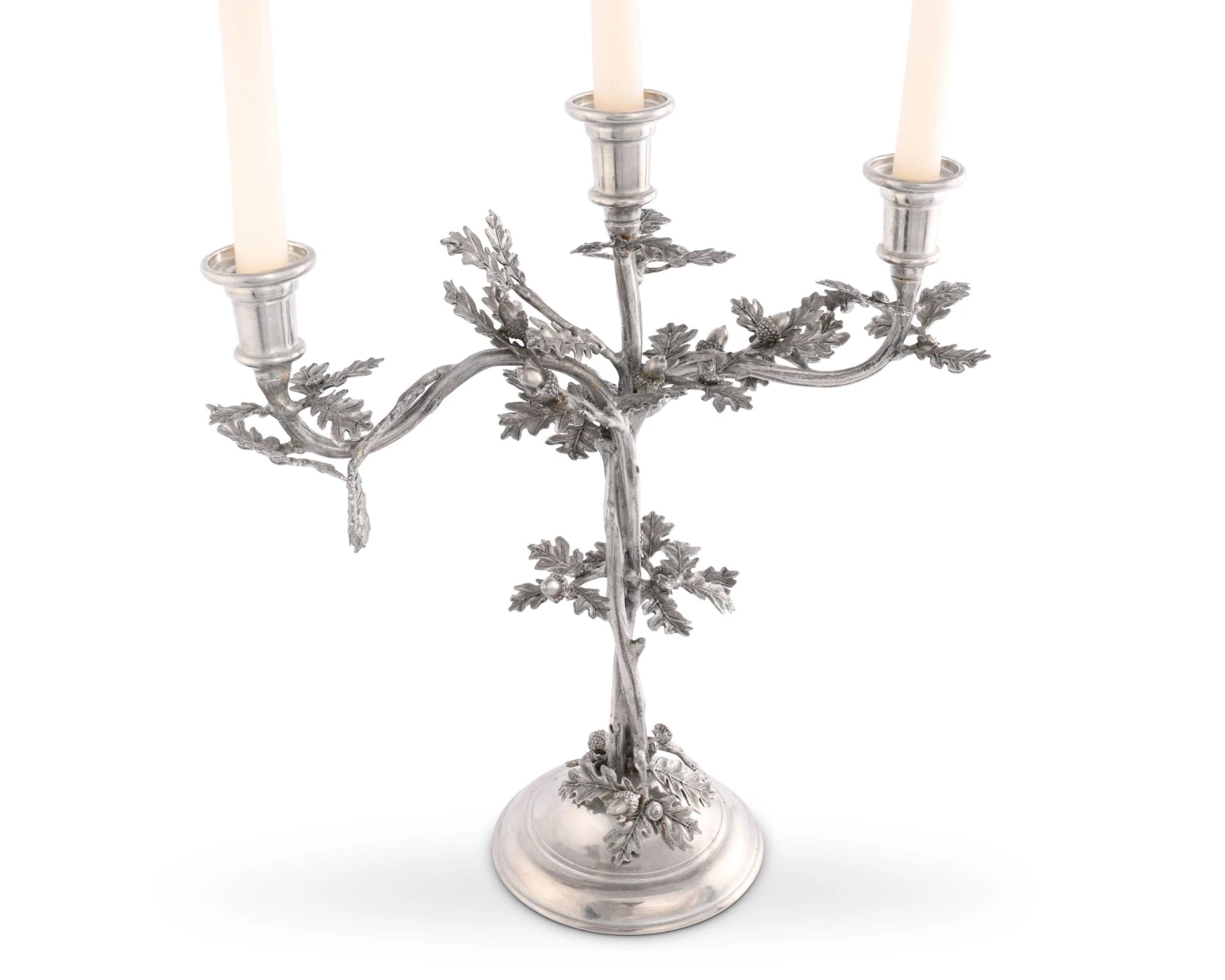Add soft romantic lighting to your music of the night with Vagabond House’s 3 socket pewter Acorn and Oak Leaf Candelabrum.