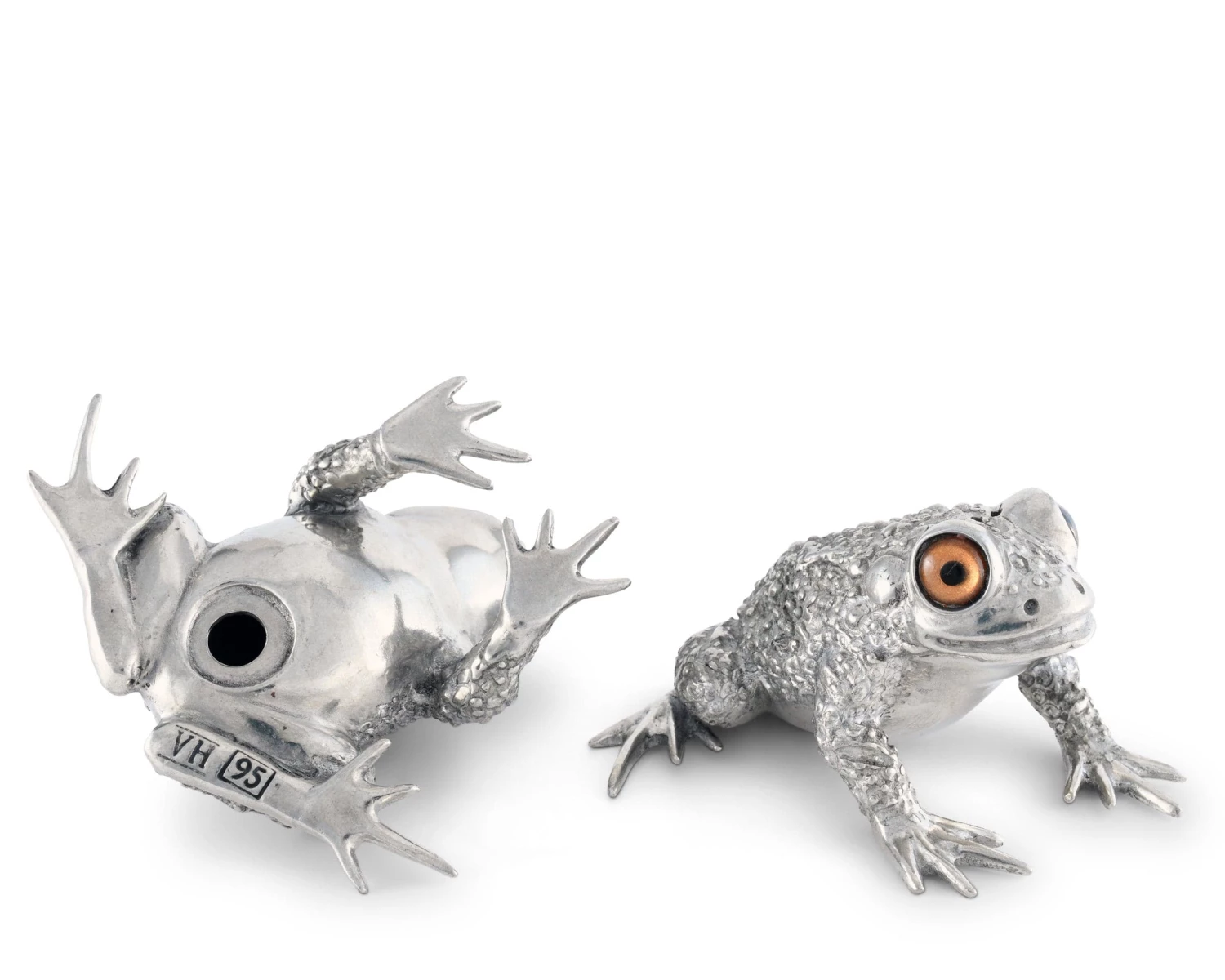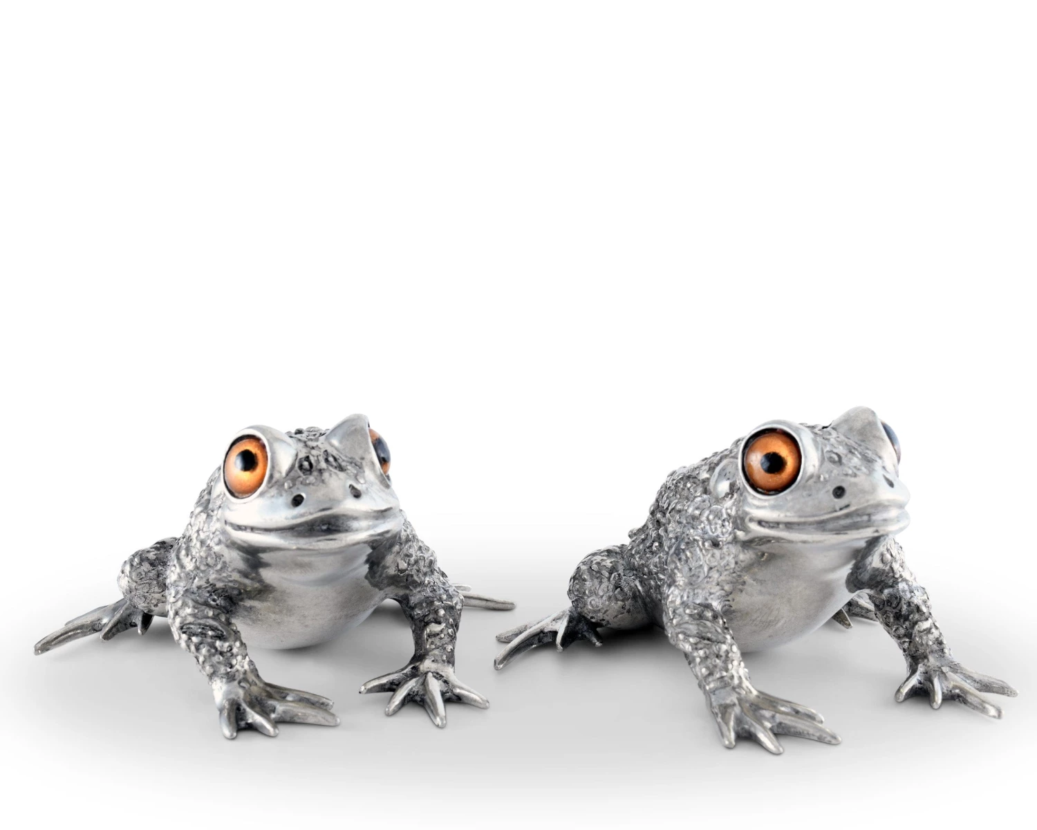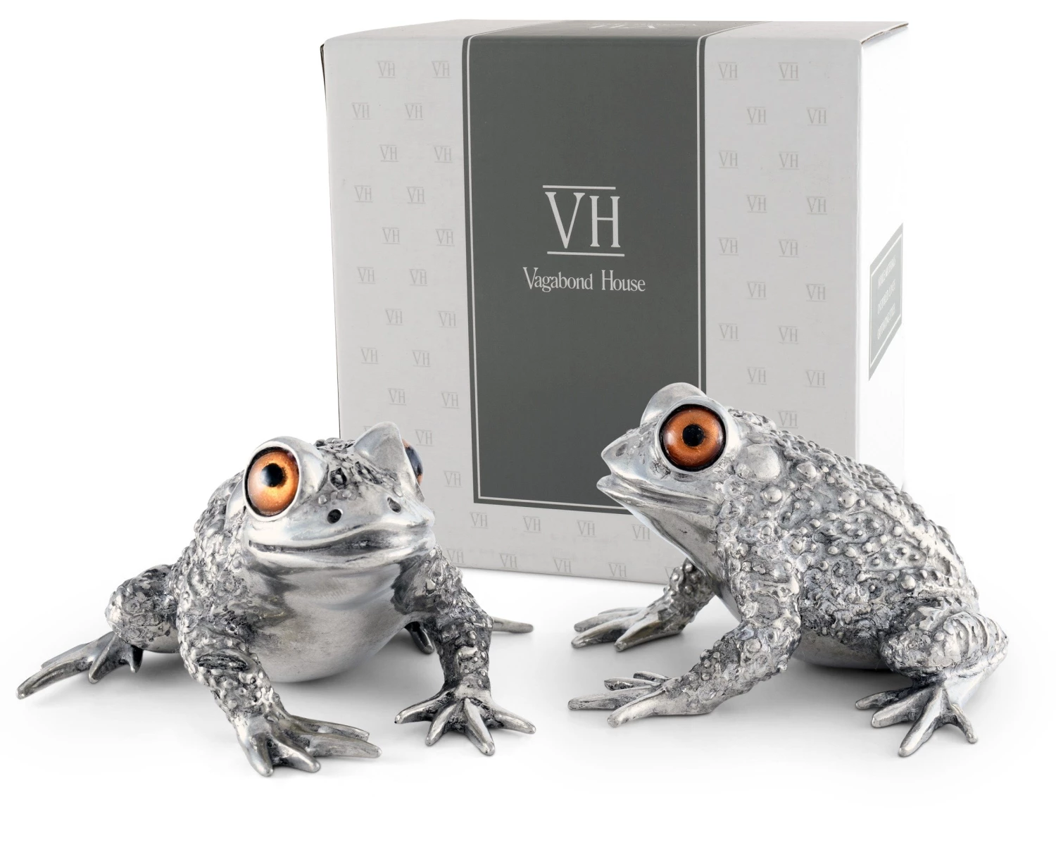 Establish a garden theme on your tabletop with Vagabond House’s Toad Salt and Pepper Set. Crafted with striking realism, these creatures feature scaly skin, webbed feet and big, attention-grabbing eyes. Easy to refill, these pure-pewter shakers contain a stopper on their underbellies.