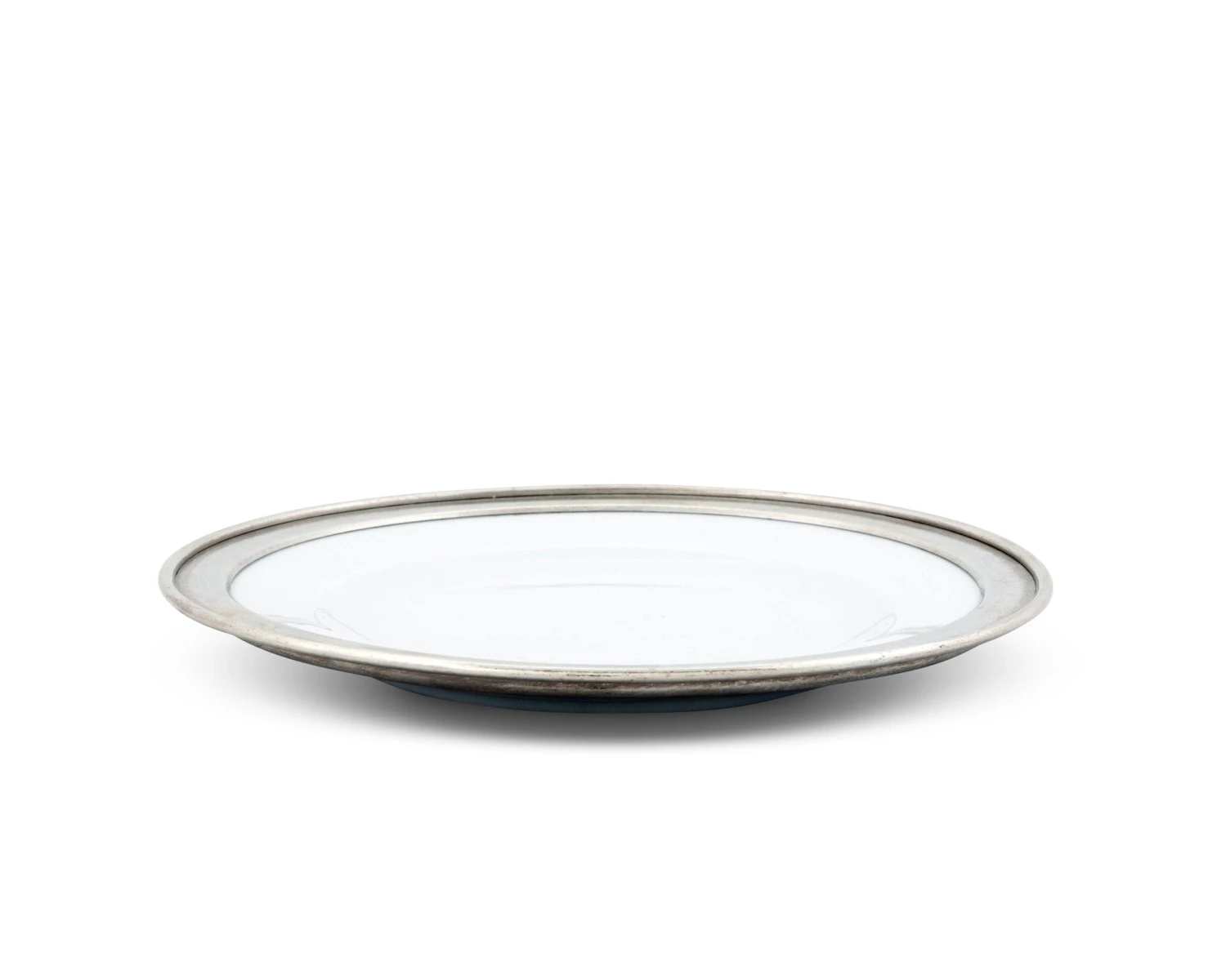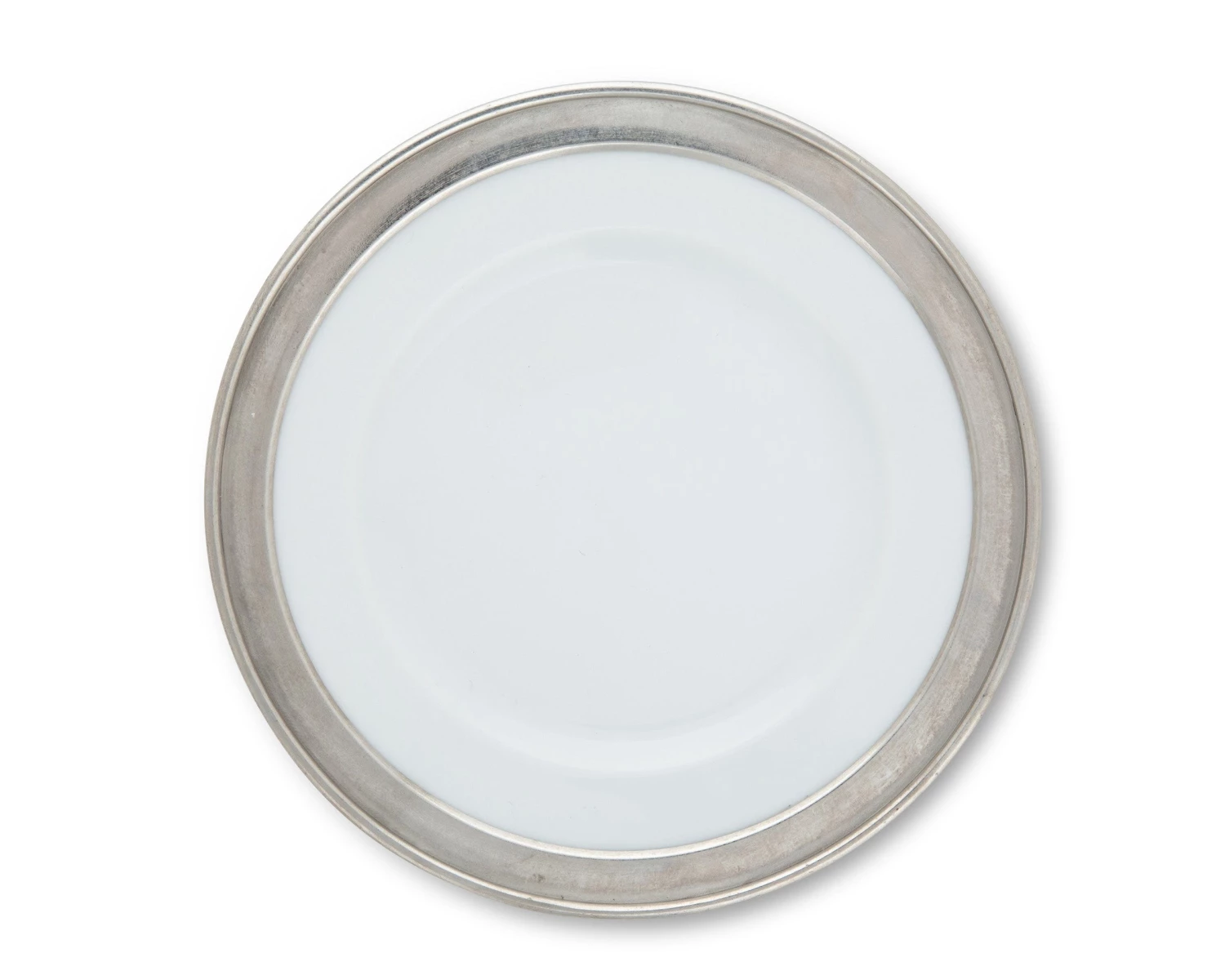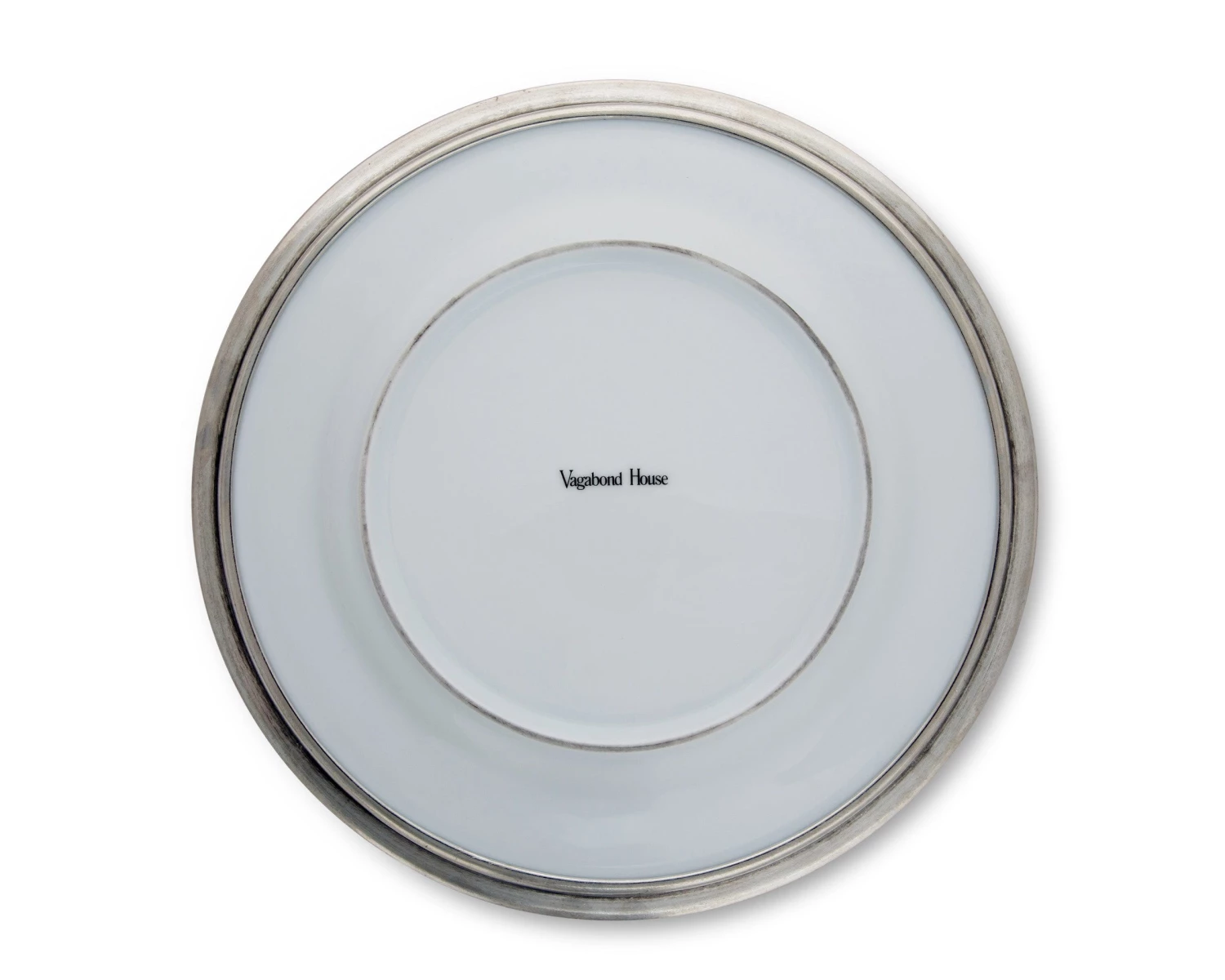 Elegant simplicity. Inspired by Mid-Century Modern design, Vagabond House’s Tribeca Salad Plates are crafted in fine porcelain. Each plate is glazed to a luminous white finish by hand and then encircled with a highly polished pewter rim. The simple elegance of the cool pewter rim and classic white porcelain allows these plates to easily be mixed and matched with others from your collection, or with their matching pieces. The Tribeca pattern is also available in dinner plates and soup bowls.