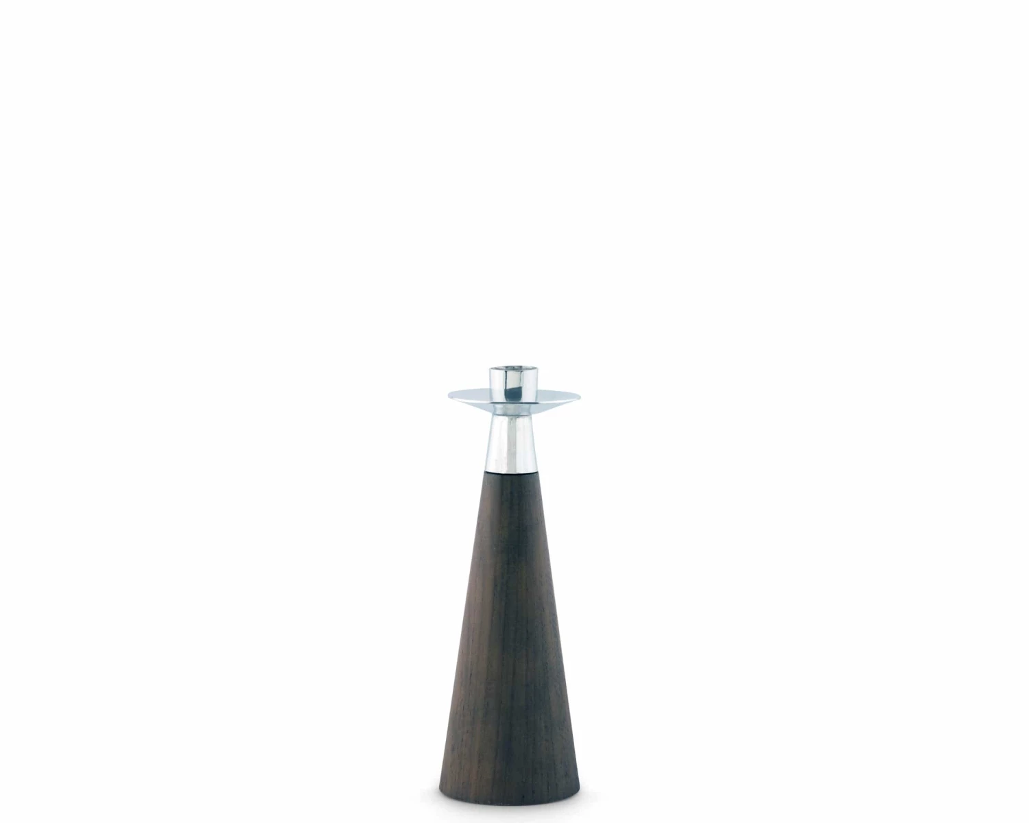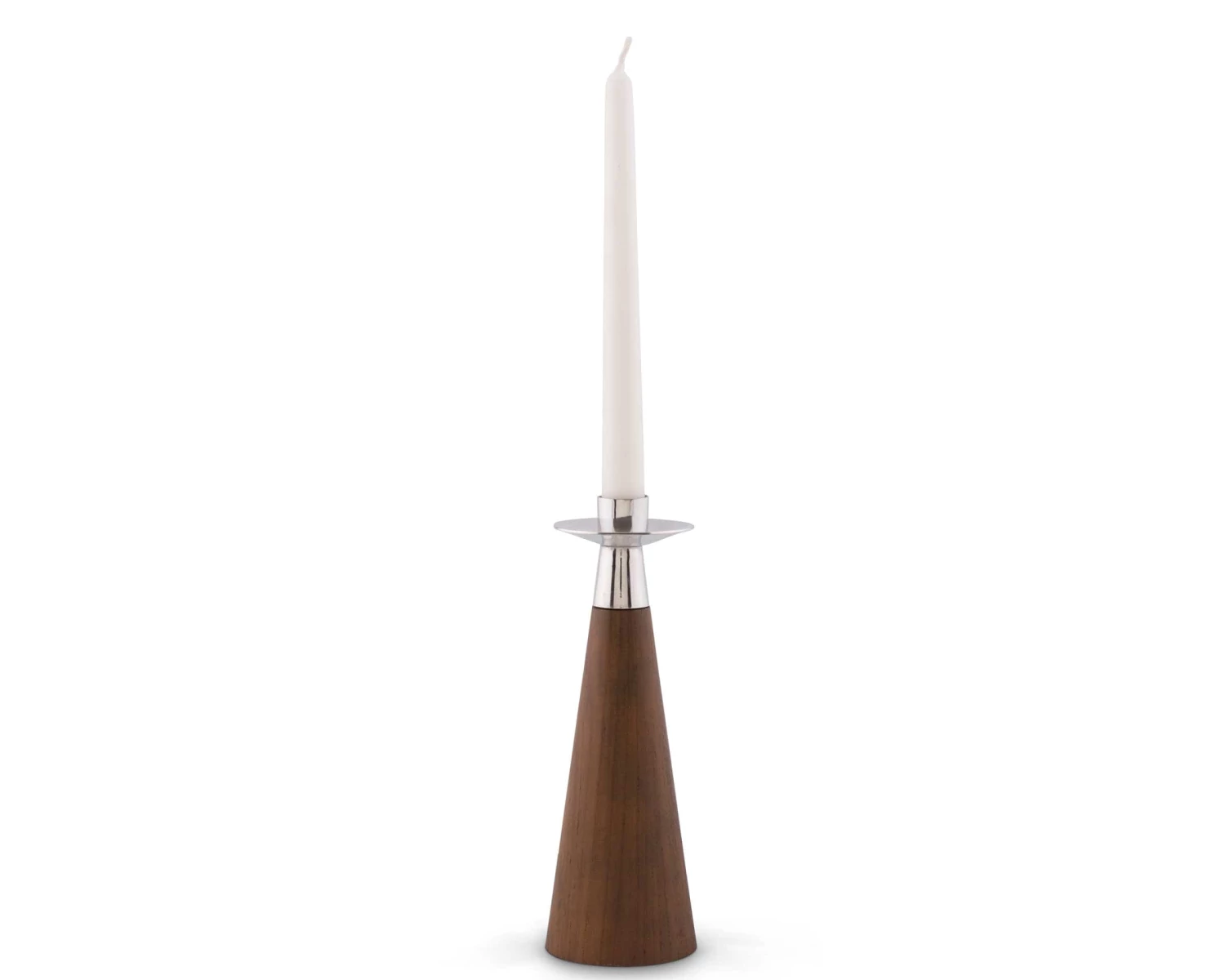 Place your best taper candles atop this Vagabond House Tribeca candlestick to add a touch of elegance to your dining table. Its slender triangular shape has a wide base for stability, and it’s made of luxurious teak wood that contrasts beautifully with its stainless steel and pewter sconce, designed to cleanly catch dripping wax. Match this sophisticated candlestick with other items from the Tribeca collection, such as cheese-cutting sets, martini glasses and salad servers, to complete an elegant tablescape at dinner parties. This candlestick stands proudly at 9 inches tall, so it doesn’t overwhelm your table but blends in with its sophisticated surroundings. Whether it’s used for special occasions or at evening dinners for two, this Tribeca candlestick provides a pleasant ambience.