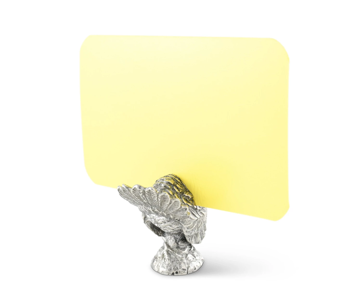 Complement your Harvest Collection with this exquisite Turkey Place Card Holder from Vagabond House. Crafted in luxury-grade pewter, our turkey features intricate feathers, large wings and realistic claws. Standing nearly two inches tall, the statuette holds cards in the opening just in front of its decorative tail.