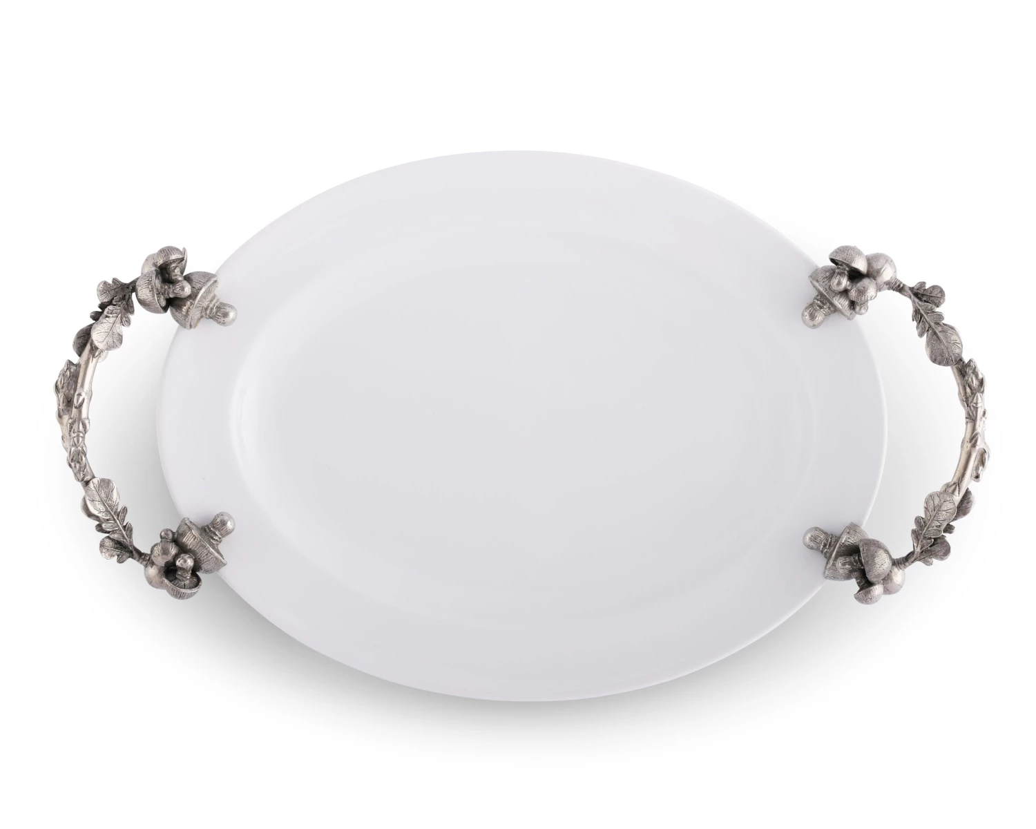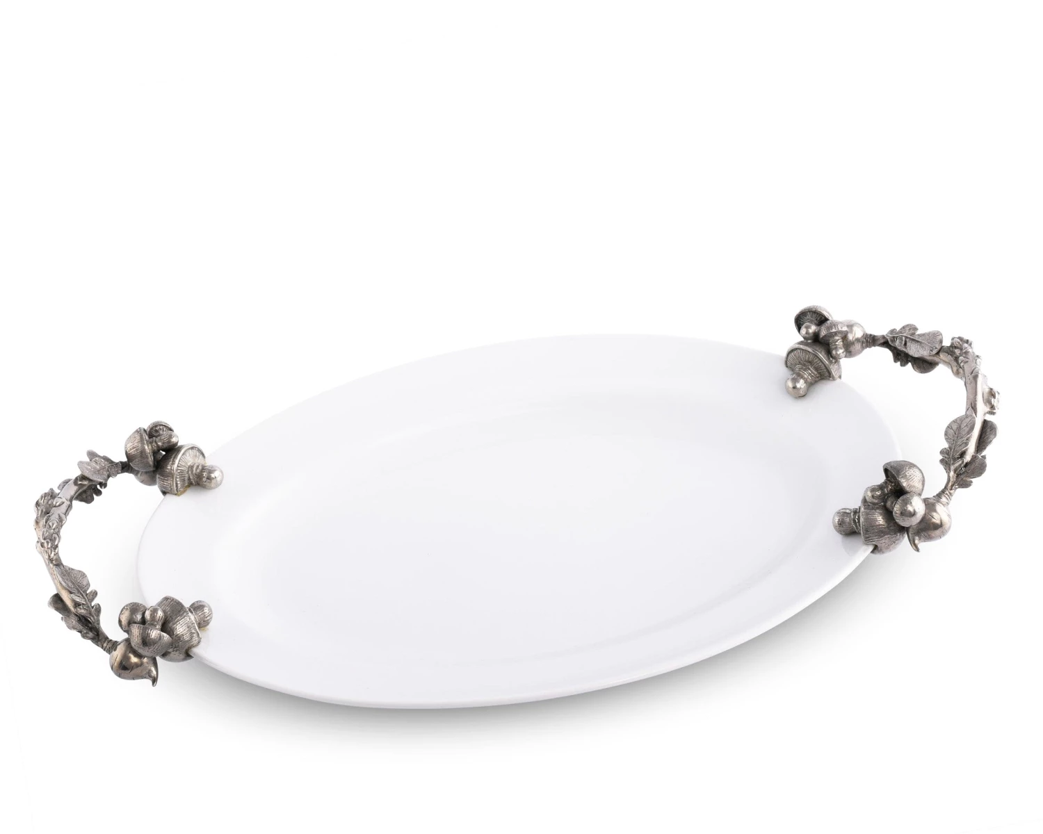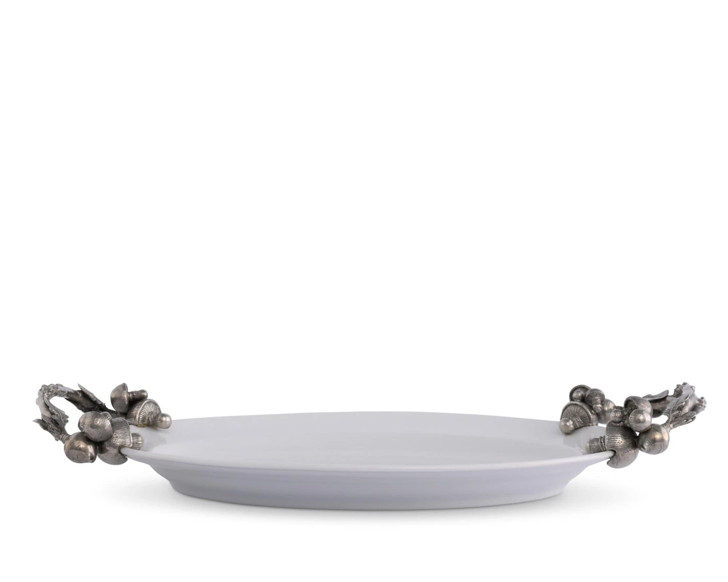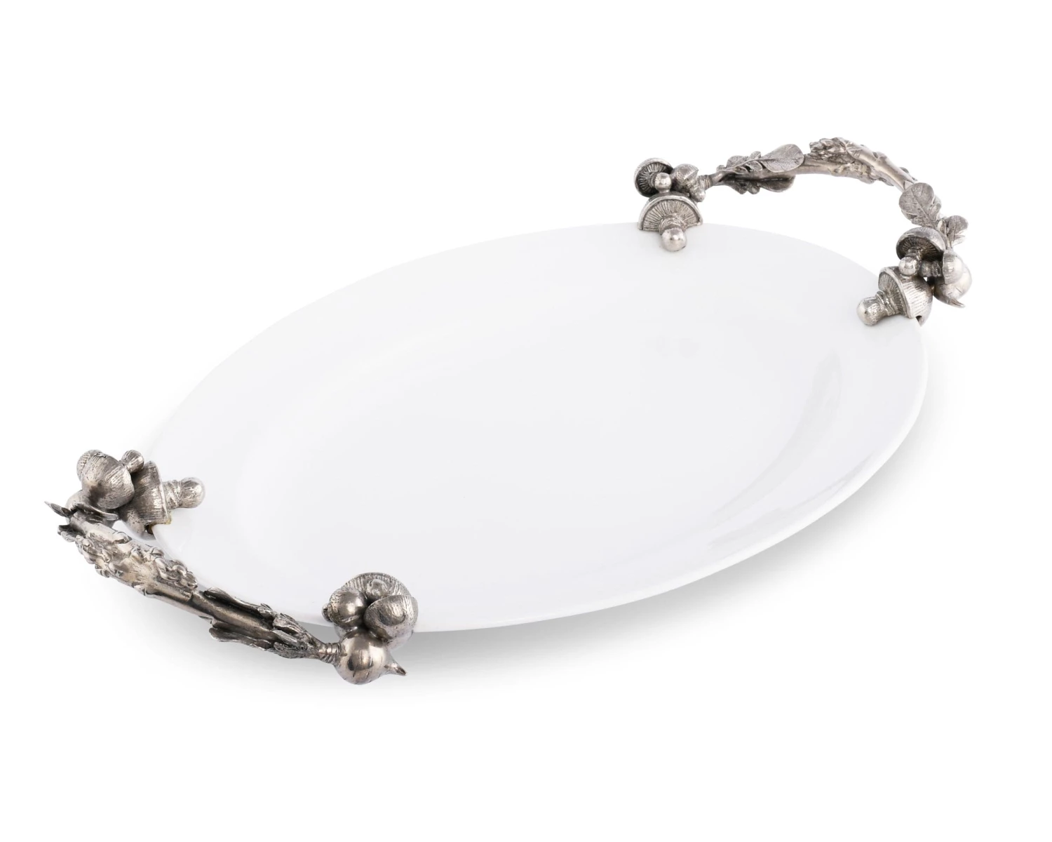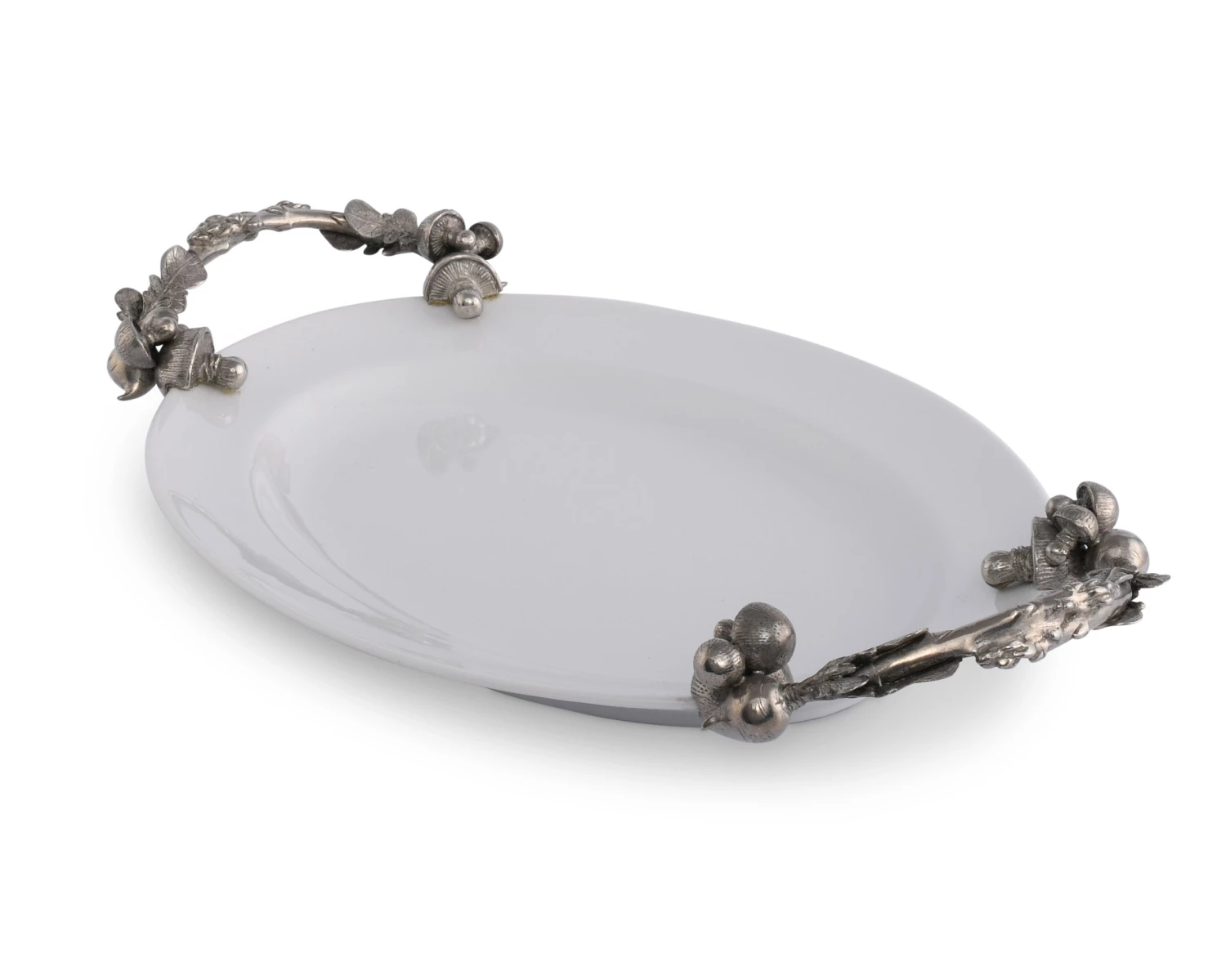 Put a fresh spin on steamed vegetables by serving them in Vagabond House’s Small Stoneware Tray. Leaves and stalks of asparagus create the dish’s curved handles, while mushrooms and radishes gather around each attachment point. Realistically crafted in luxury-grade pewter, these designs display tremendous detail against our elegant stoneware.
