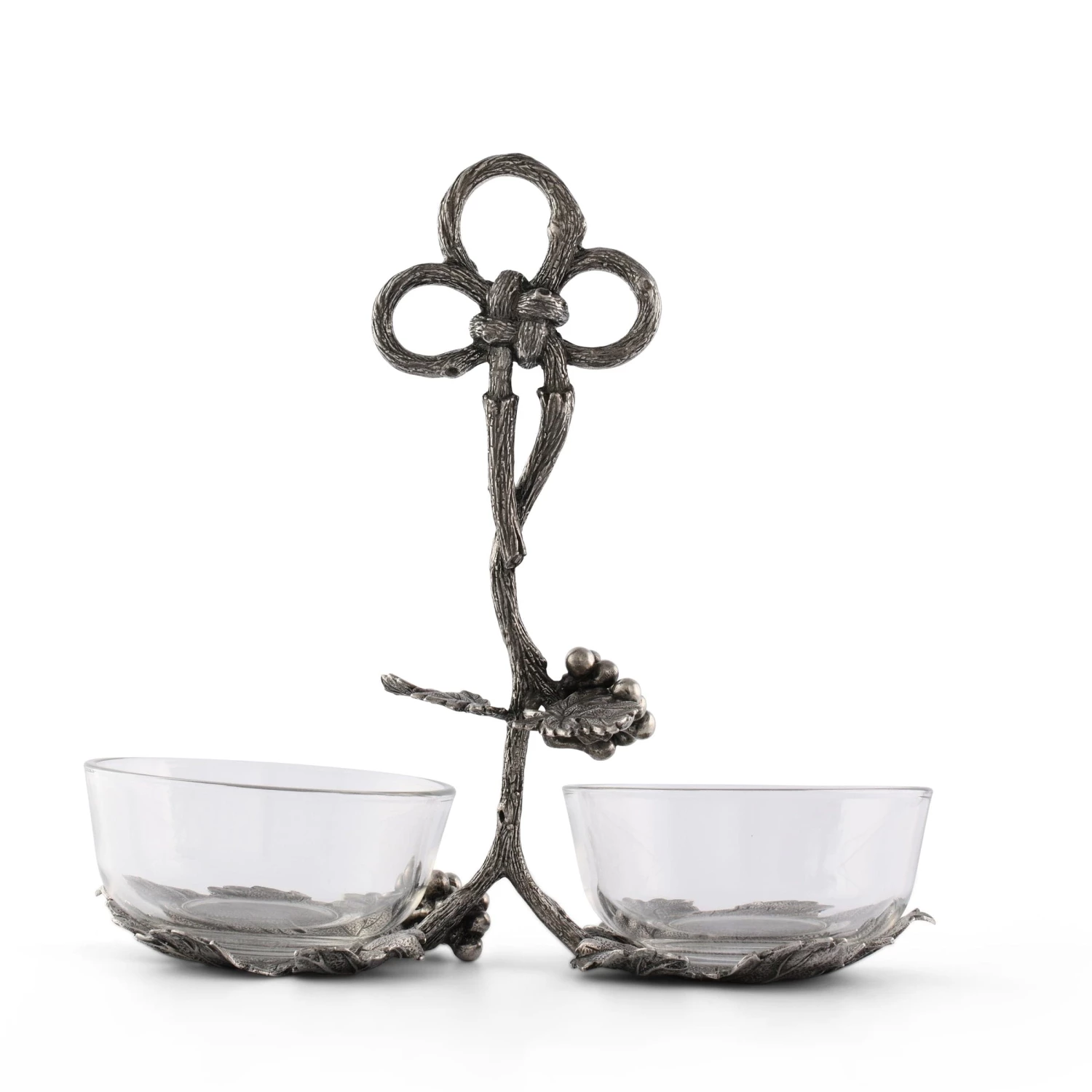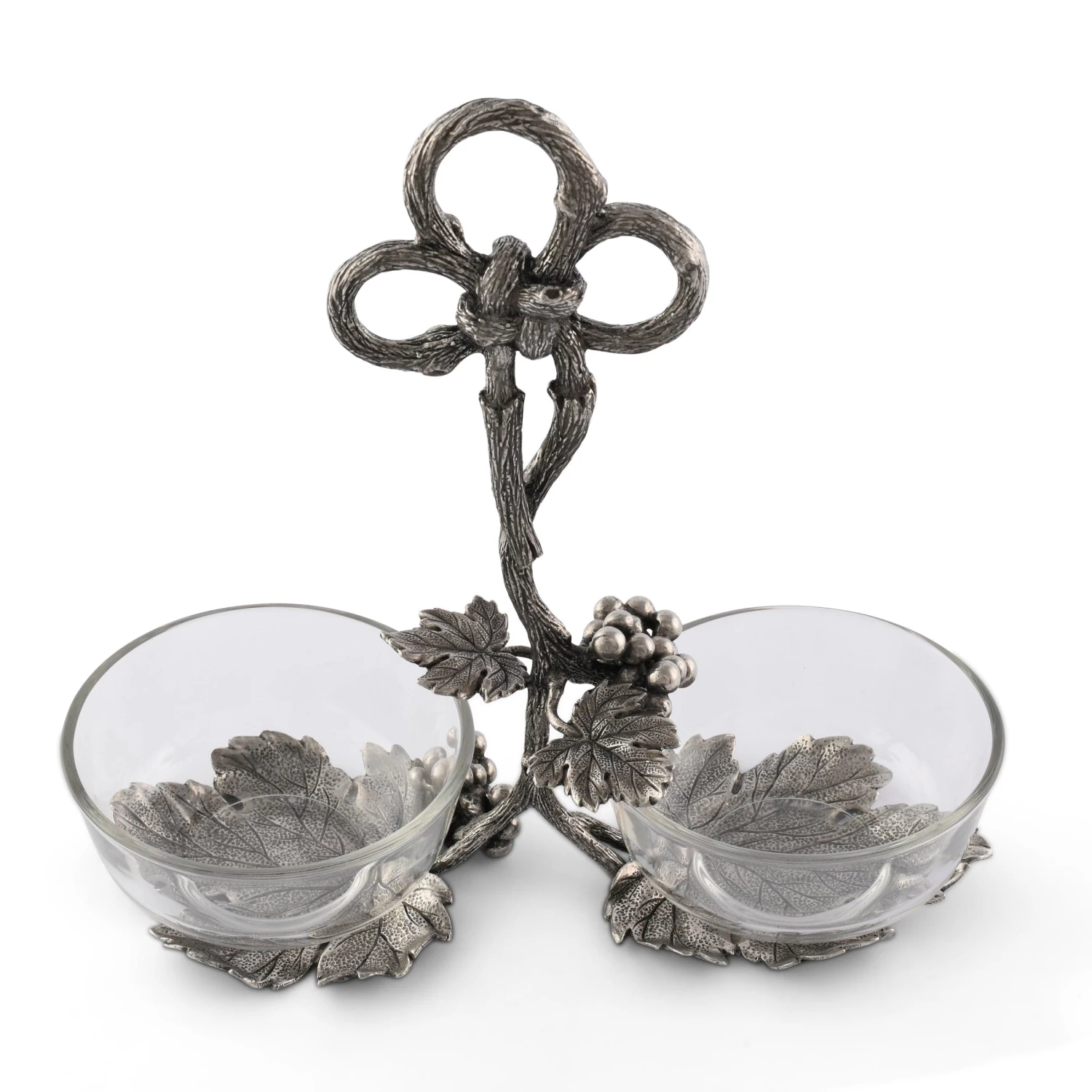 Include the creative design of this Vineyard Condiment Server in any setting to dramatic effect. Thick, pure-pewter vines twist up into a three-ringed clover before knotting in the middle to form elevated handles. Exquisite leaves branch off the base of these vines to support the removable, glass bowls with their large blades. Smaller leaves and bundles of grapes accent the base and bowls as they extend off the vine support.