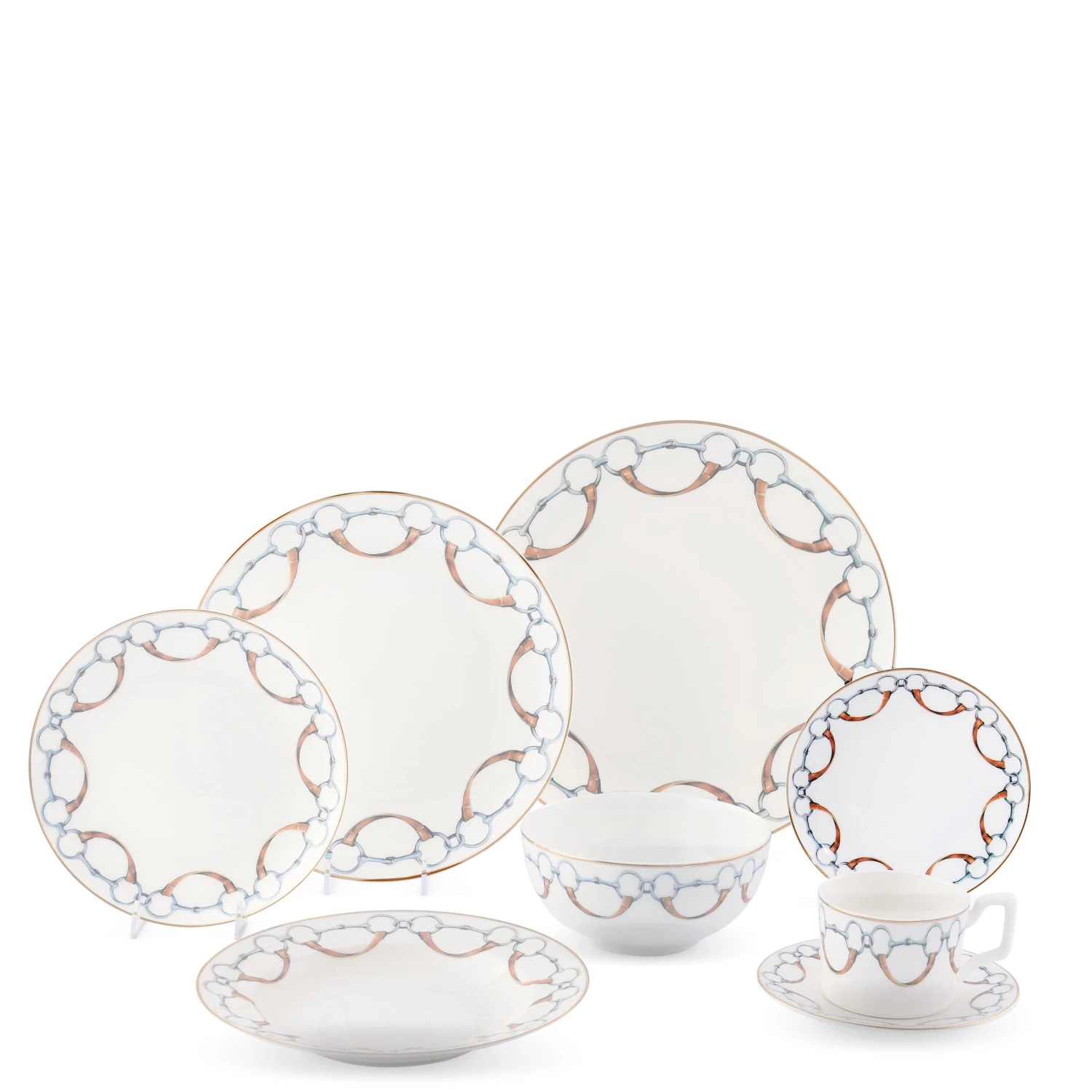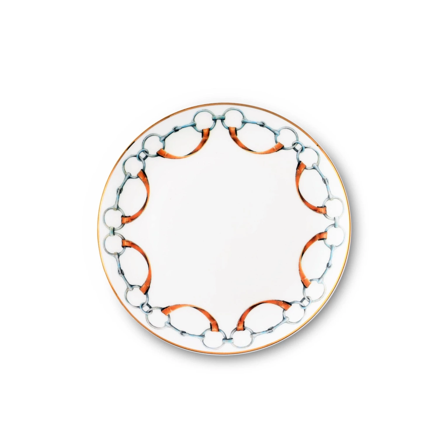 The Wellington Bit collection is a sleek twist on the iconic equestrian snaffle bit theme, taking it a step further into a striking Bone China dinnerware collection of polished sophistication. Whether tail-gaiting at the polo field or setting an elegant table for a formal dinner party, Vagabond House presents a statement of classic high style and is sure to garner attention and admiration. Fine Bone China was designed and hand-drawn by Vagabond House’s master artist Leesa Greenlee. Shiny Gold rimmed add a formal class and style to the 6.5 inch Bread Plate.