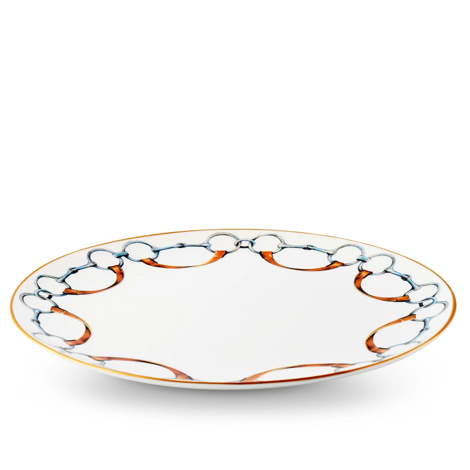 The Wellington Bit collection is a sleek twist on the iconic equestrian snaffle bit theme, taking it a step further into a striking Bone China dinnerware collection of polished sophistication. Whether tail-gaiting at the polo field or setting an elegant table for a formal dinner party, Vagabond House presents a statement of classic high style and is sure to garner attention and admiration. Fine Bone China was designed and hand-drawn by Vagabond House’s master artist Leesa Greenlee. Shiny Gold rimmed add a formal class and style to the 12 inch Charger.