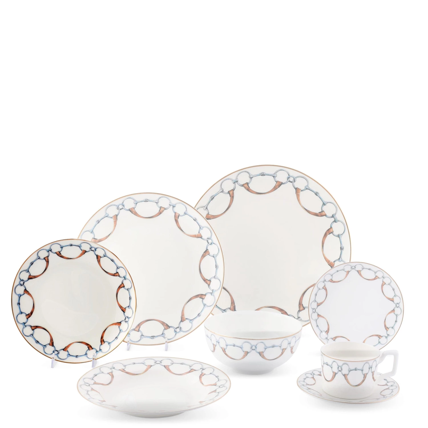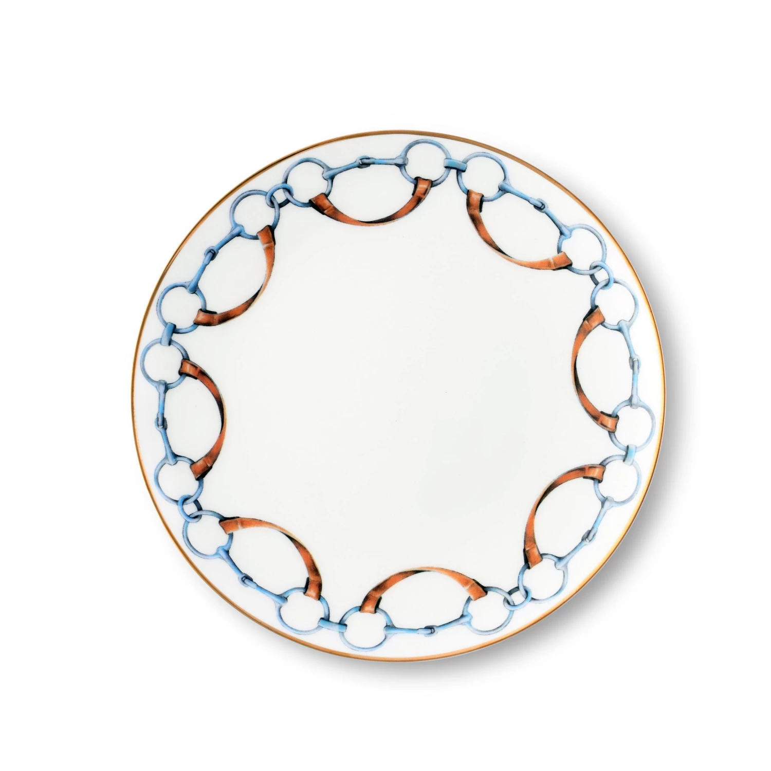 The Wellington Bit collection is a sleek twist on the iconic equestrian snaffle bit theme, taking it a step further into a striking Bone China dinnerware collection of polished sophistication. Whether tail-gaiting at the polo field or setting an elegant table for a formal dinner party, Vagabond House presents a statement of classic high style and is sure to garner attention and admiration. Fine Bone China was designed and hand-drawn by Vagabond House’s master artist Leesa Greenlee. Shiny Gold rimmed add a formal class and style to the 8.5 inch Salad Plate.