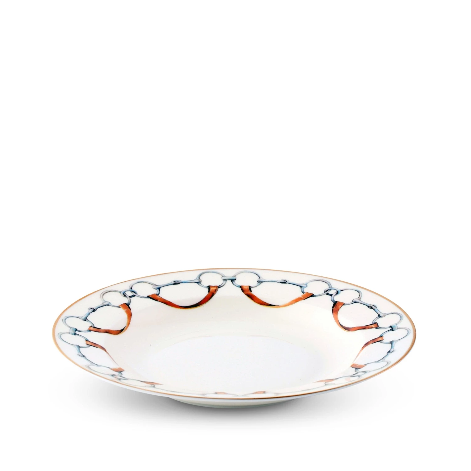 The Wellington Bit collection is a sleek twist on the iconic equestrian snaffle bit theme, taking it a step further into a striking Bone China dinnerware collection of polished sophistication. Whether tail-gaiting at the polo field or setting an elegant table for a formal dinner party, Vagabond House presents a statement of classic high style and is sure to garner attention and admiration. Fine Bone China was designed and hand-drawn by Vagabond House’s master artist Leesa Greenlee. Shiny Gold rimmed add a formal class and style to the 4 inch tall Cereal / Dip Bowl.