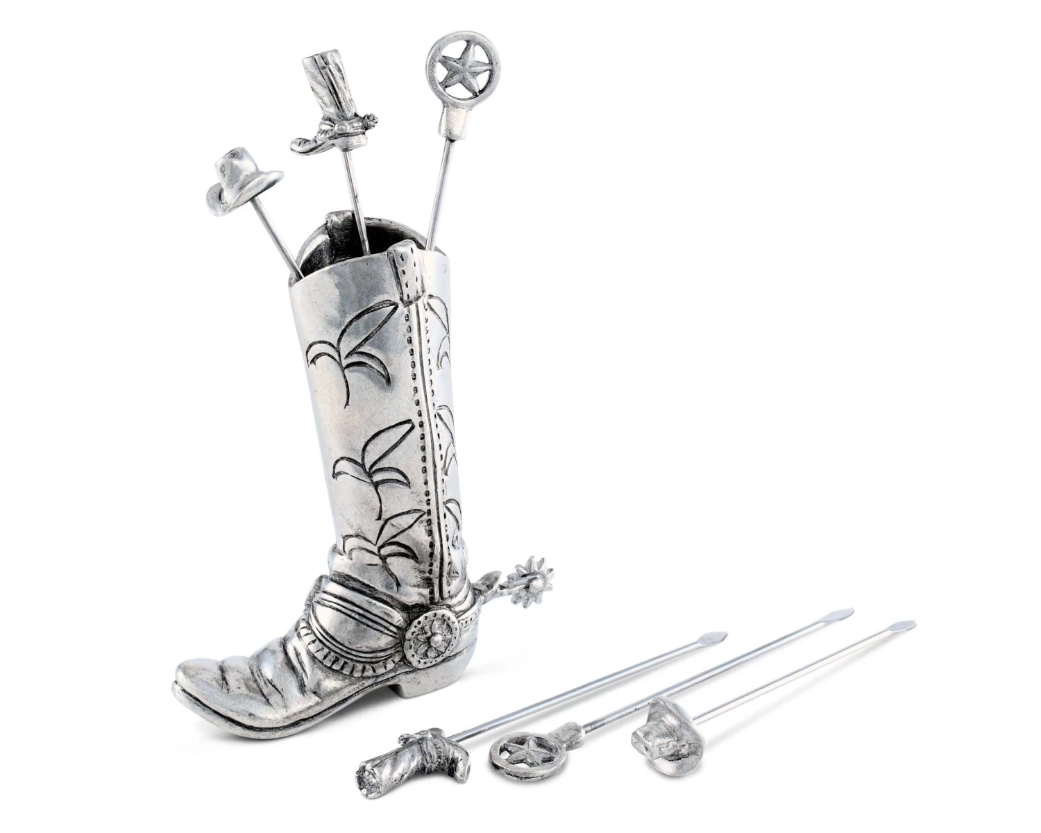 The pure Vagabond House pewter boot holder is accurately embossed and intricately detailed with spurs and buckles. Each pick sports a different, western themed topper, hat, boot and a branding iron.
