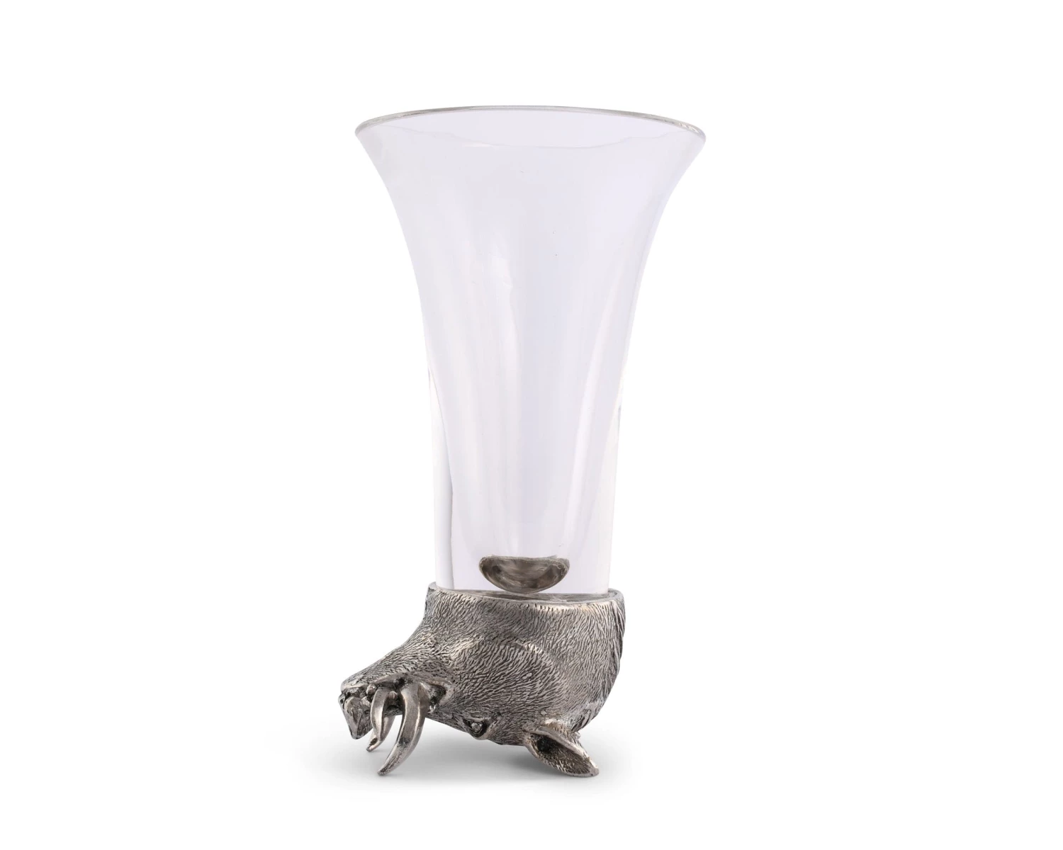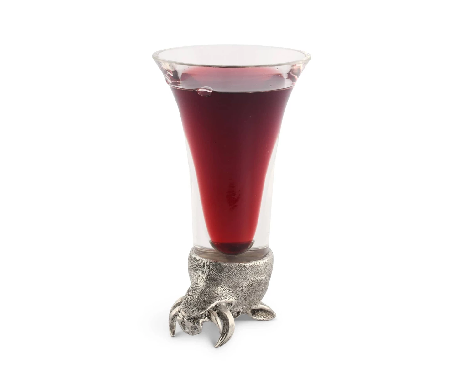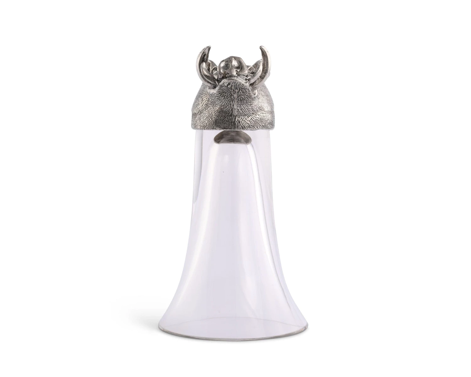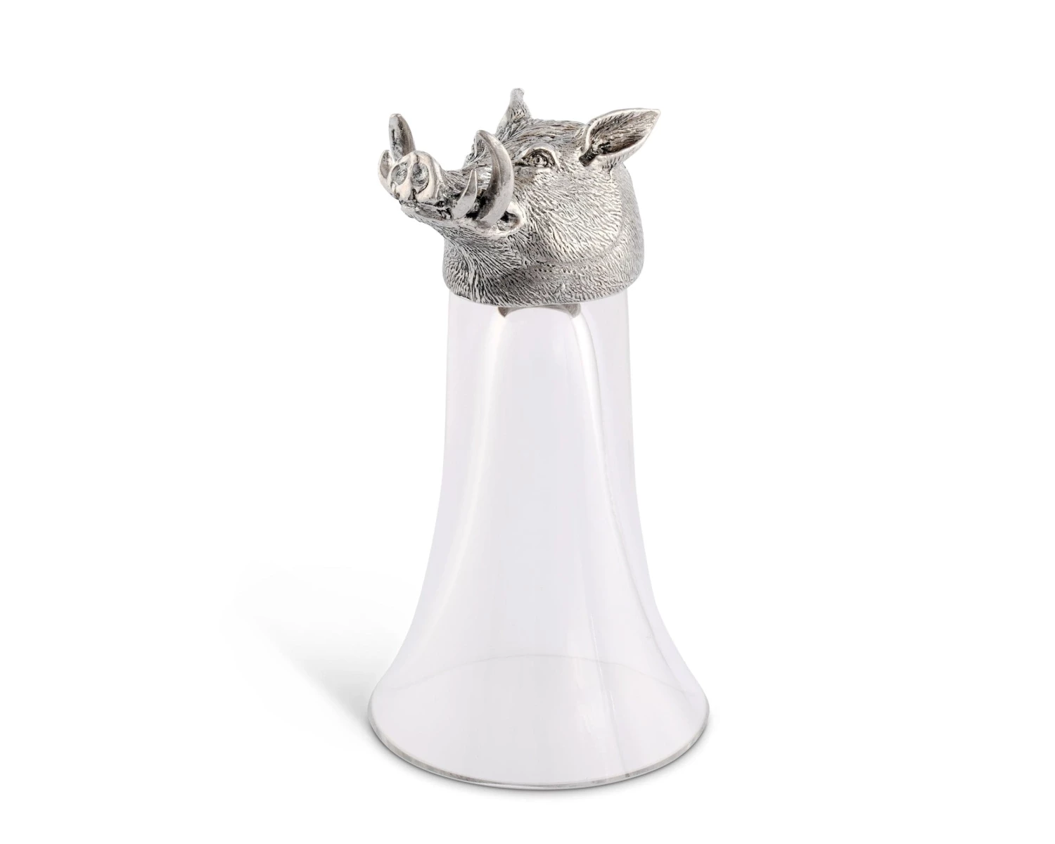 Vagabond House pewter is the secret to the rich detail on these embellished clear glass stirrup cups crowned with a highly detailed and impressive figure of a wild boar head.