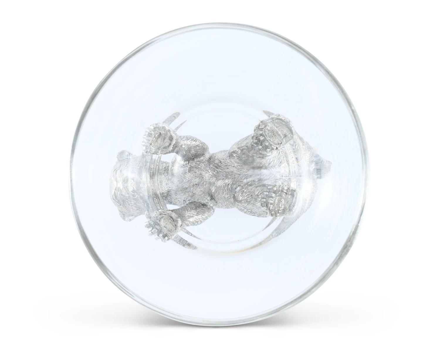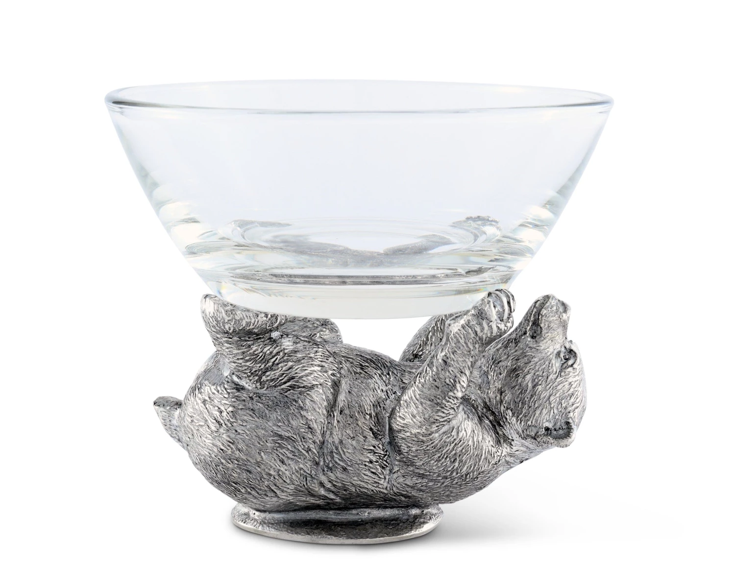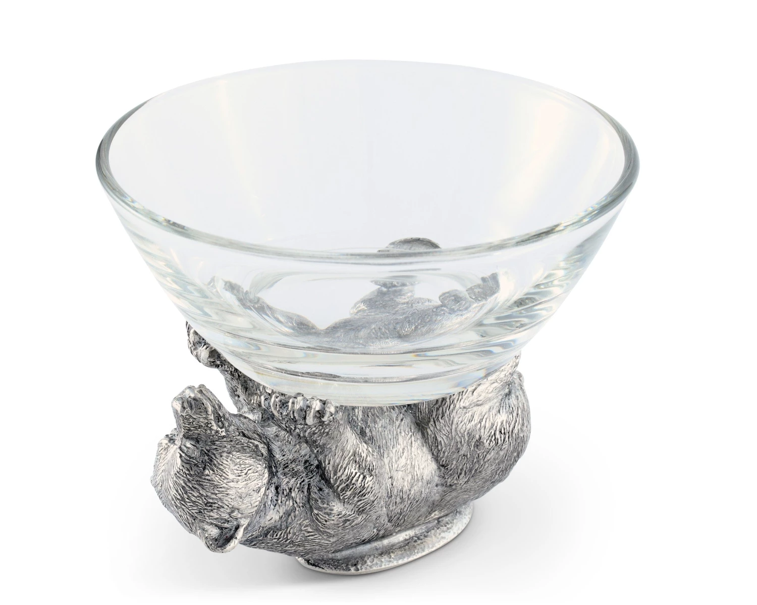 While this delightful bear does not have the whole world in his hands, he is doing a fine balancing act with Vagabond House’s pewter embellished clear glass sauce bowl.